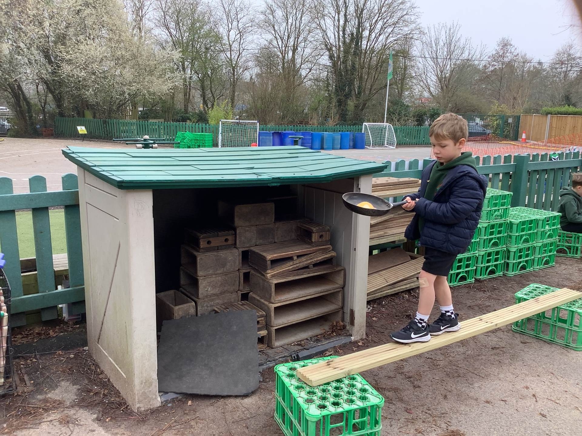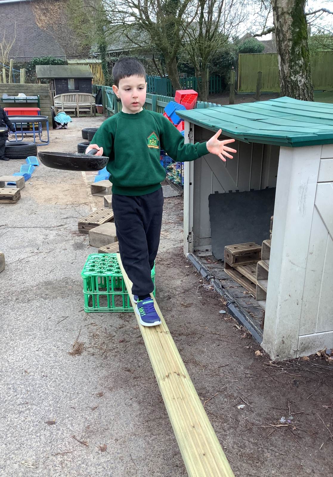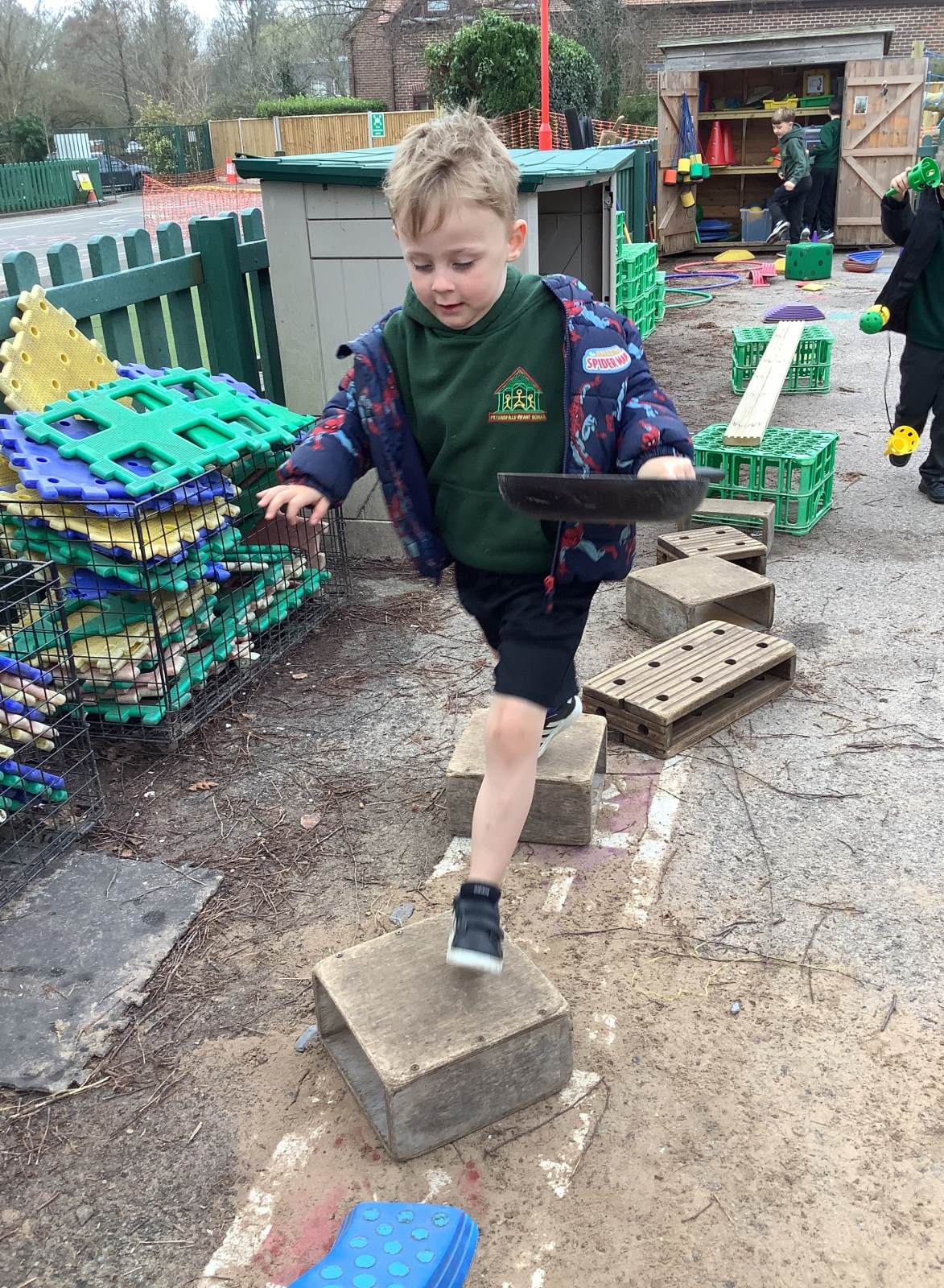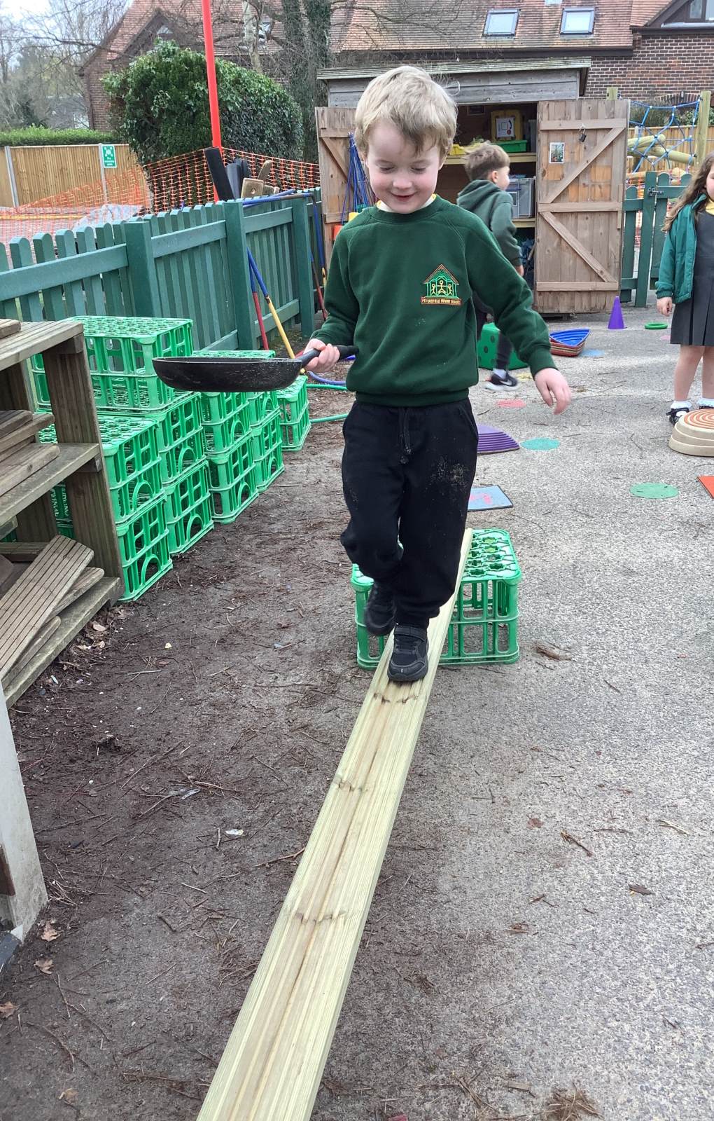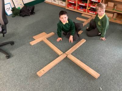 We have also taken our maths learning outside, making Numberblock 4 with the big green crates.