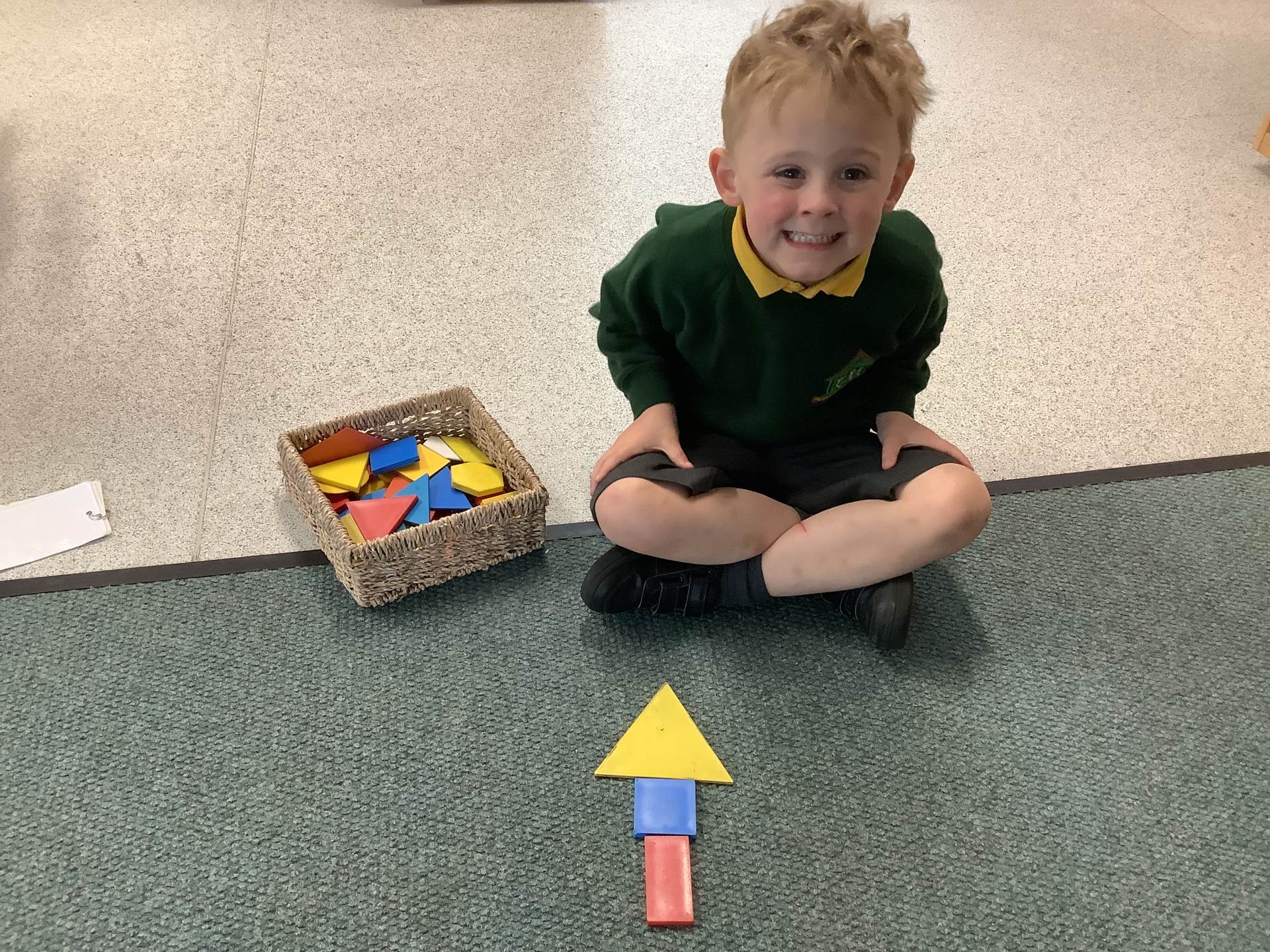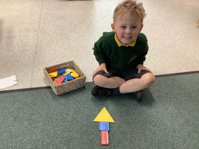 In Maths, we have been thinking about shape. Using pattern blocks, we used trial and error to complete some outlined pictures. We had to arrange, match and fit our shapes into the outlines. There were some great mathematical discussions going on!