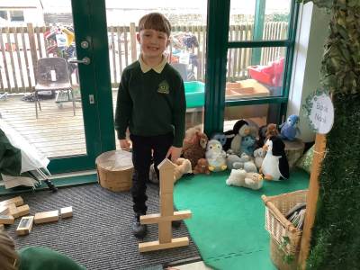 This week we have been learning all about the importance of storytellers as part of our RE. We know that books are important (and can be exciting, serious, sad or funny), and we know that a good storyteller is important too! Outside, we investigated objects to find out if they would float or sink. We also went on a maths hunt, and recorded what we spotted using tally charts and numerals - we subitised and 'used our eyes' instead of counting! We have been comparing Petersfield to Antarctica, and enhanced this learning by making loose part snowflake pictures.