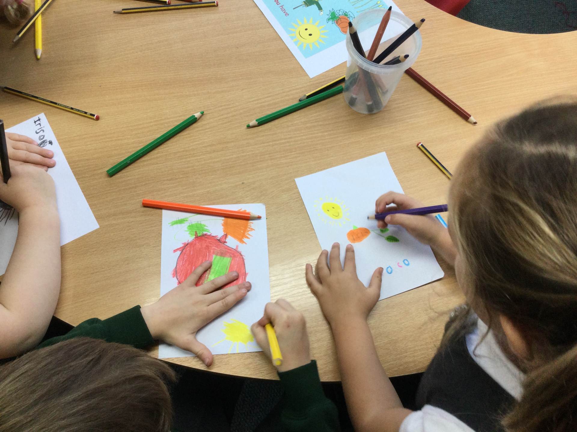 In Drawing Club, we’ve taken inspiration from the story of Chicken Likin. The children used their imaginations to create new twists to the tale, introduce new characters, and describe exciting settings. Alongside their writing, they produced some fantastic drawings that really brought their ideas to life.
