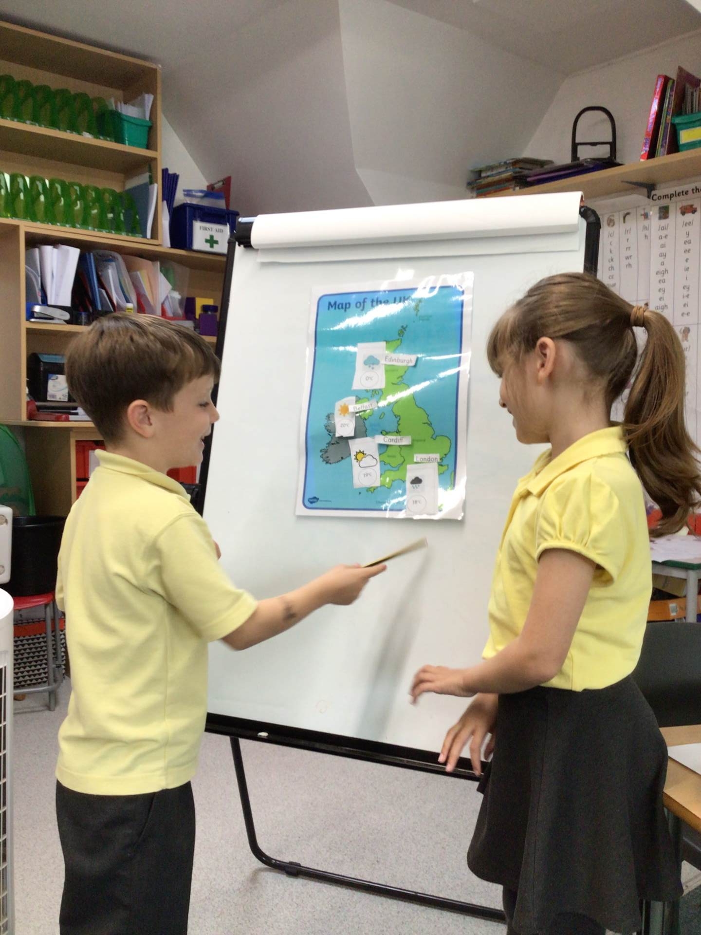 In Geography we became little meteorologists! We labelled the cities of the four countries in the UK on a map and then decided what the weather might be like there. We then performed a weather forecast to our friends. We used geographical vocabulary, such as north, south, east and west, we named the capital cities and used vocabulary related to the weather.