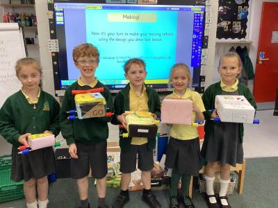 In DT we practised using wheels and axles. We used Lego, Mobilo and Knex to make vehicles that could move. We learned about fixed axles, where the wheels move on their own, and free axles, where the wheels and axle turn together. We tried out different axle holders and tested our models to see which worked the best.