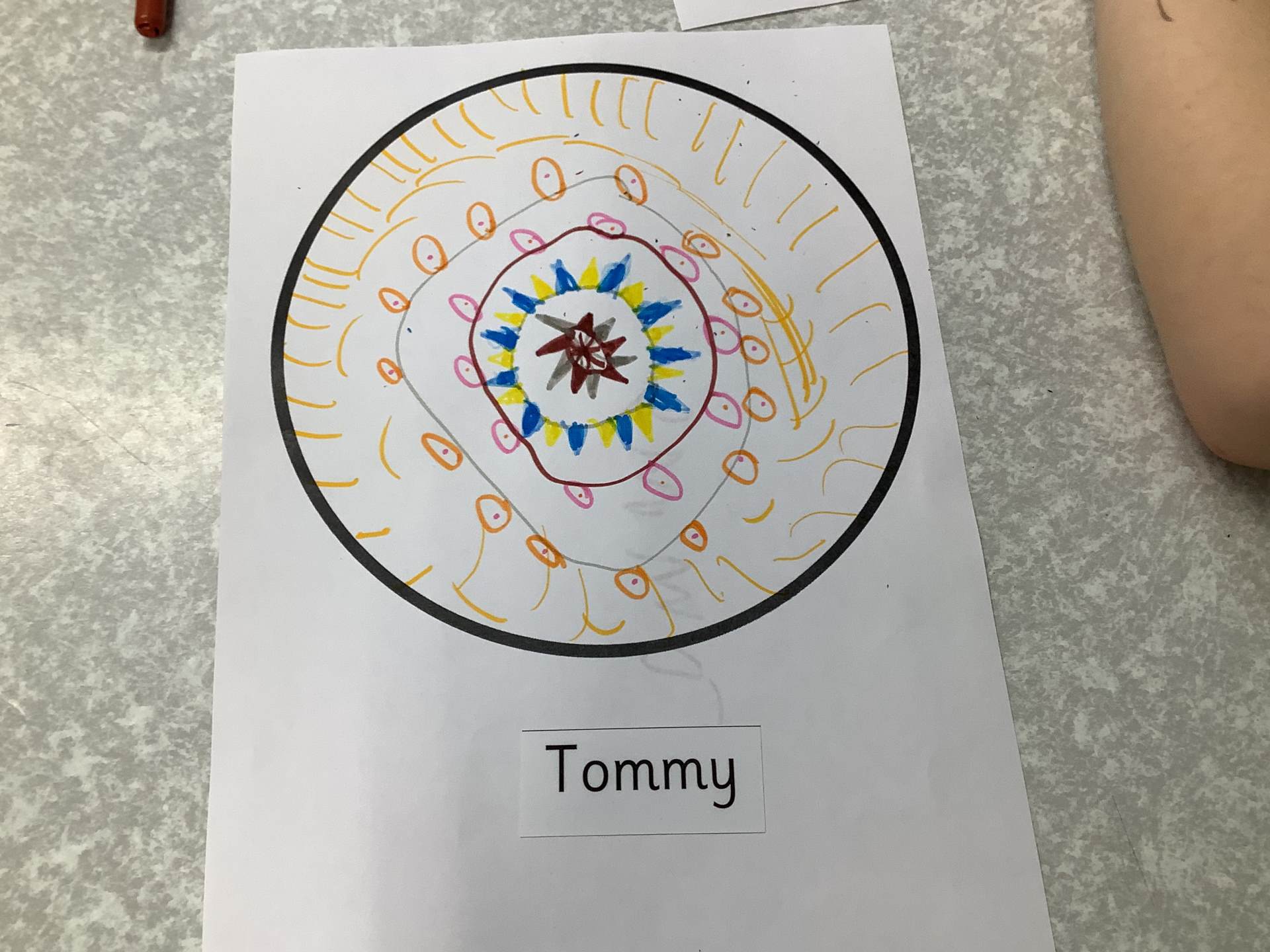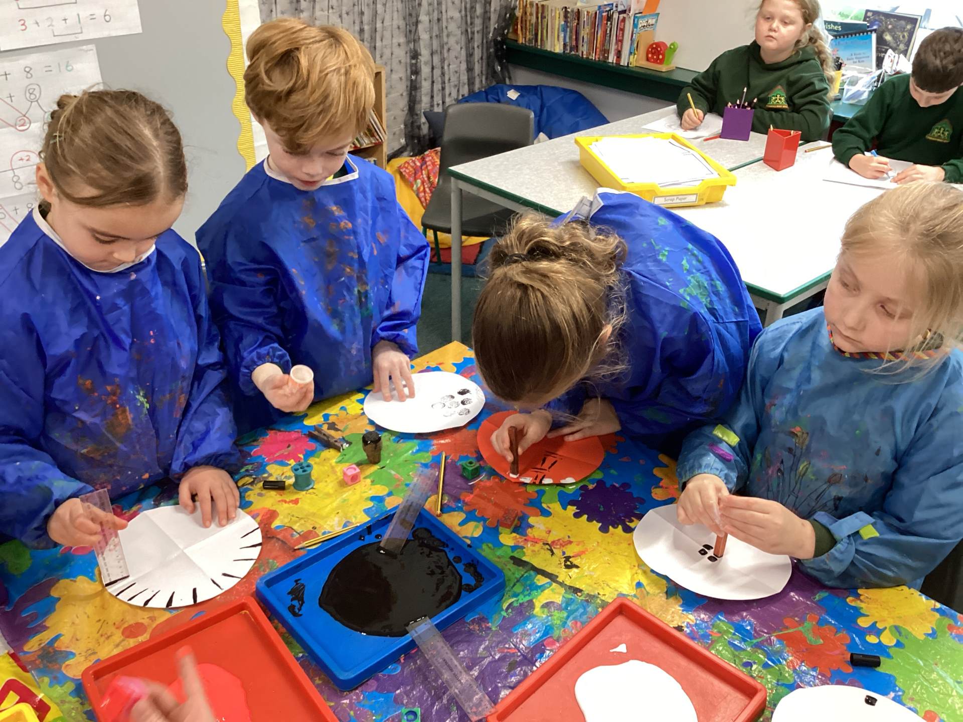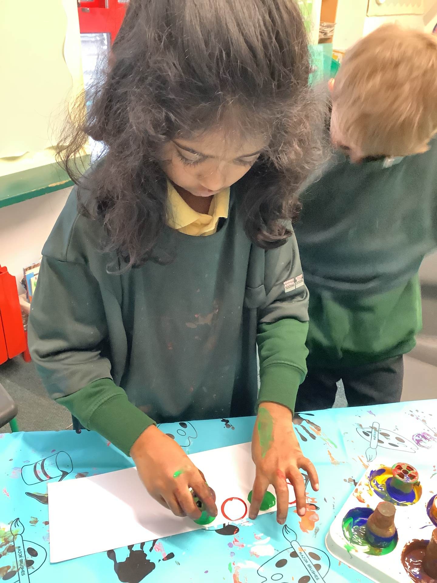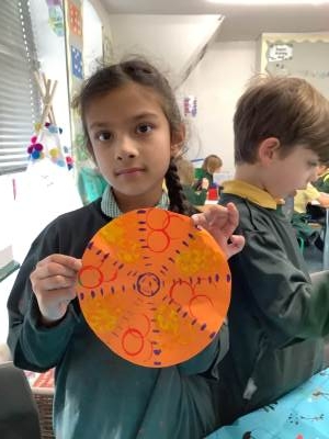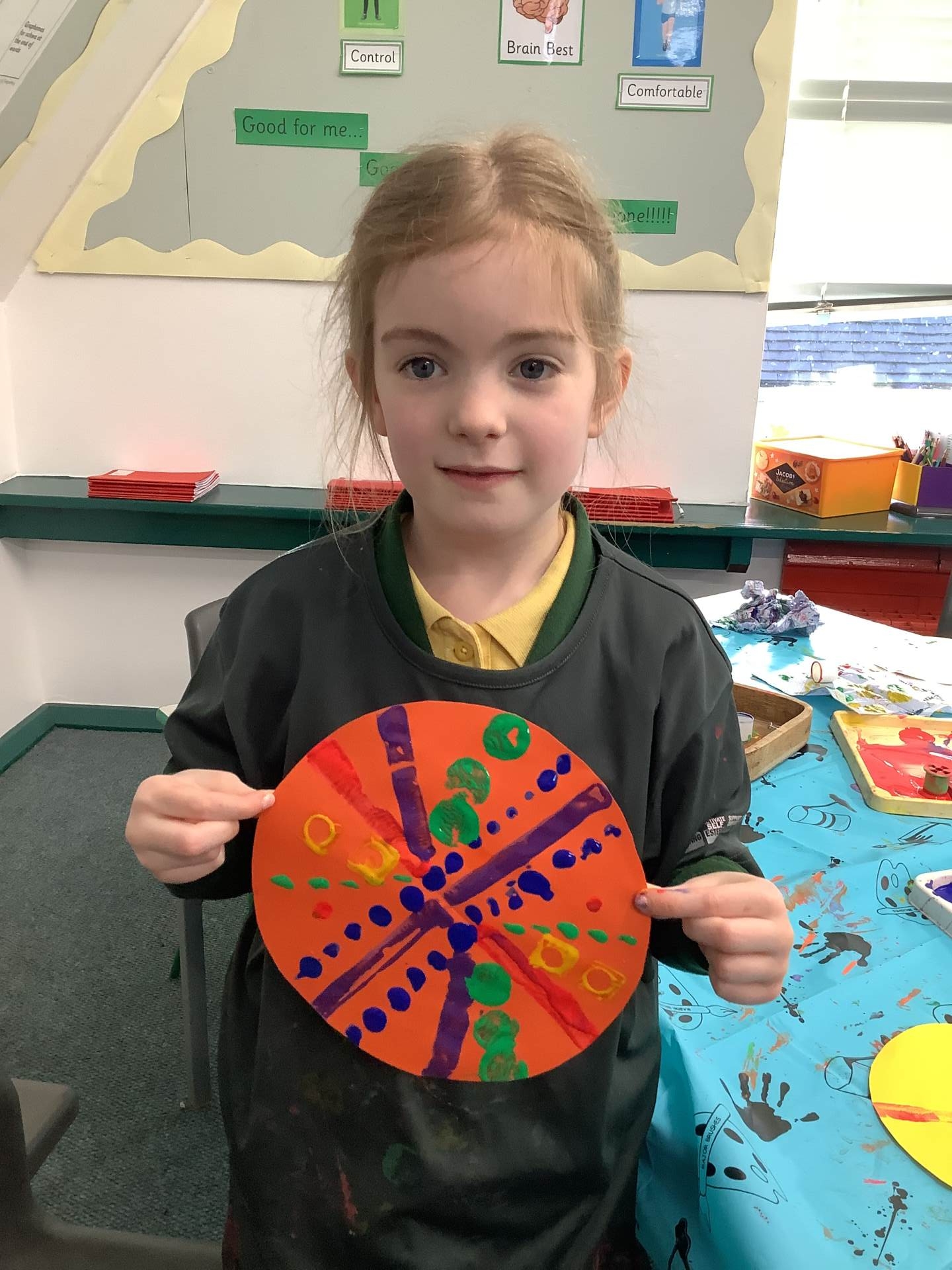 In Art this week we have been using paint and free moving objects to create patterns on circular paper.