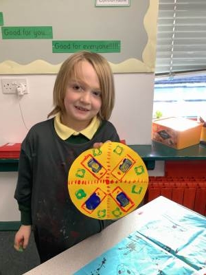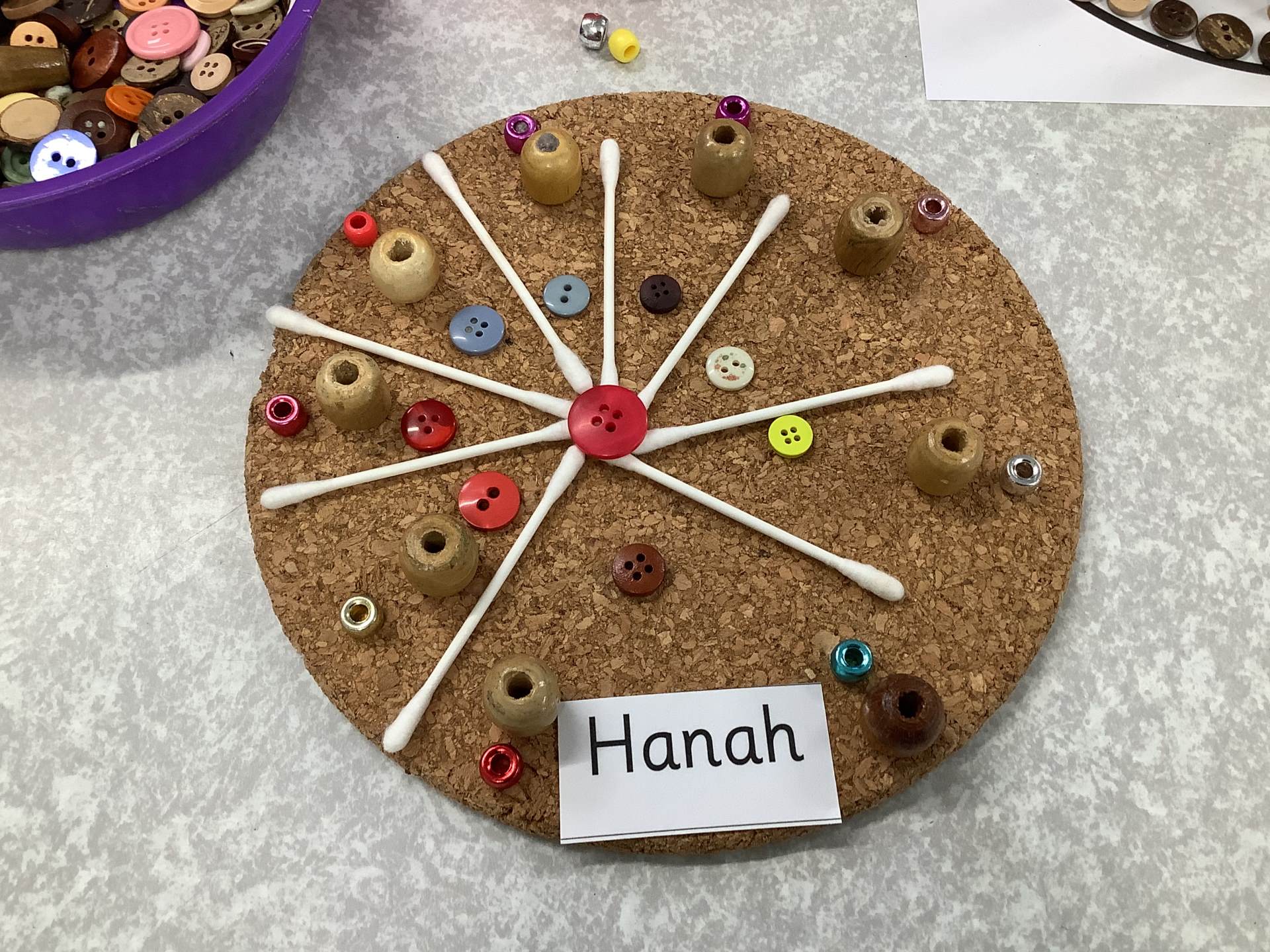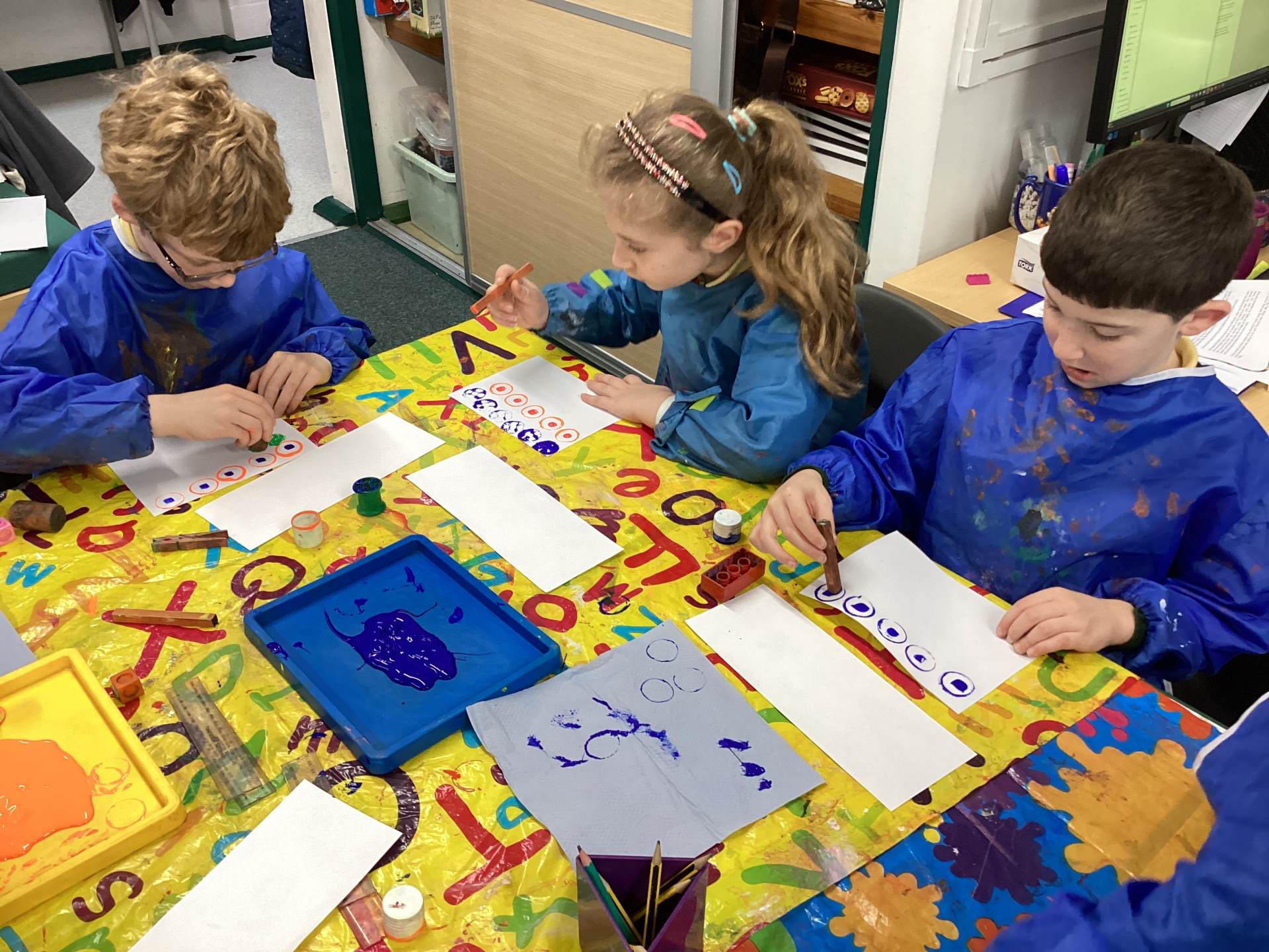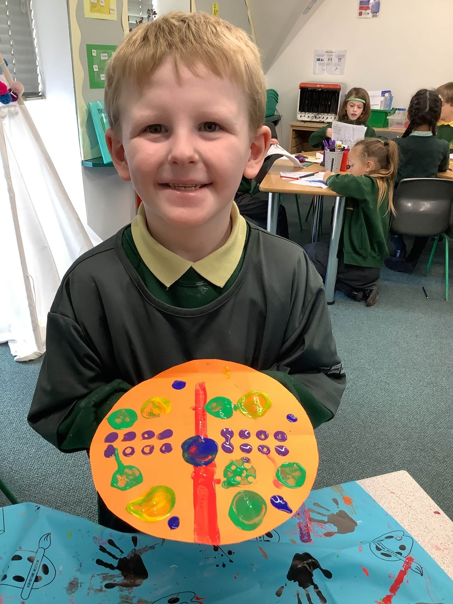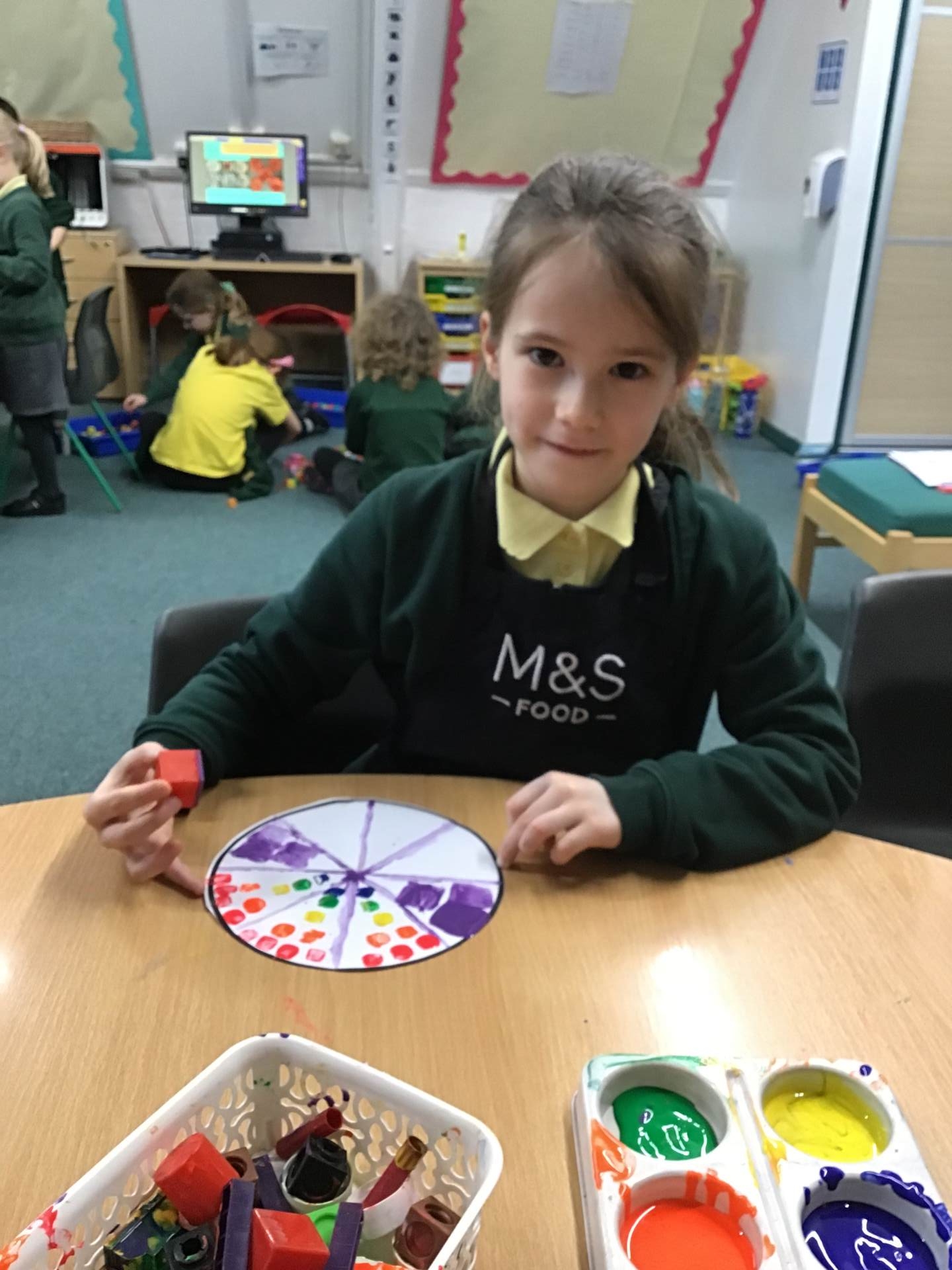 In Art this week we have been using paint and free moving objects to create patterns on circular paper.