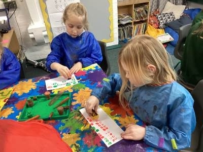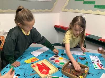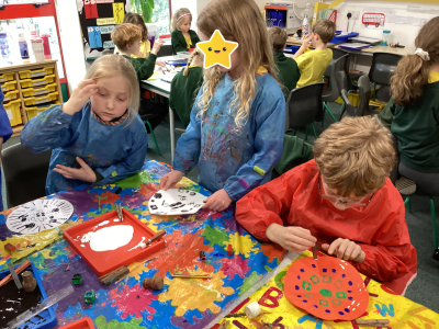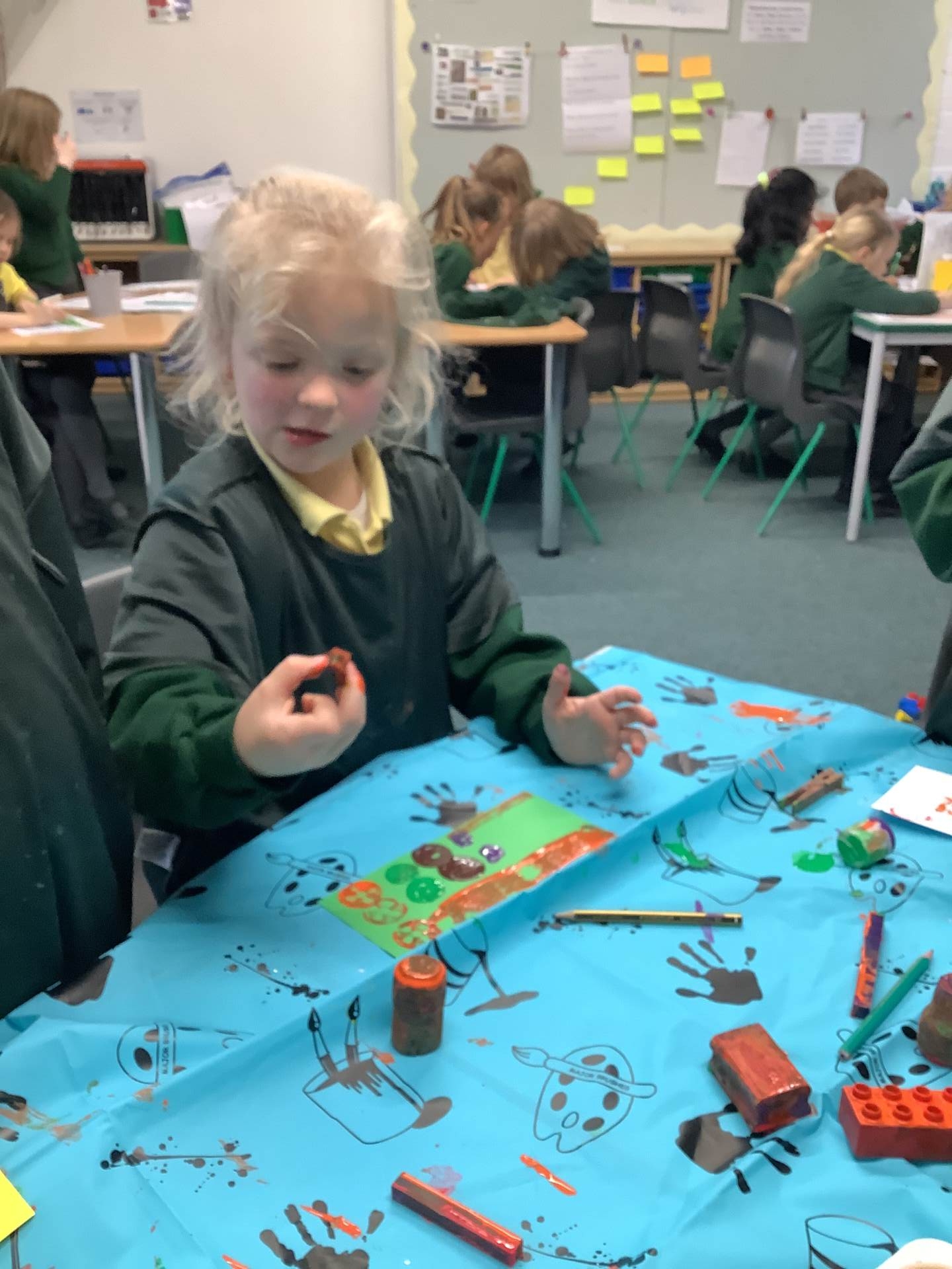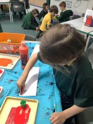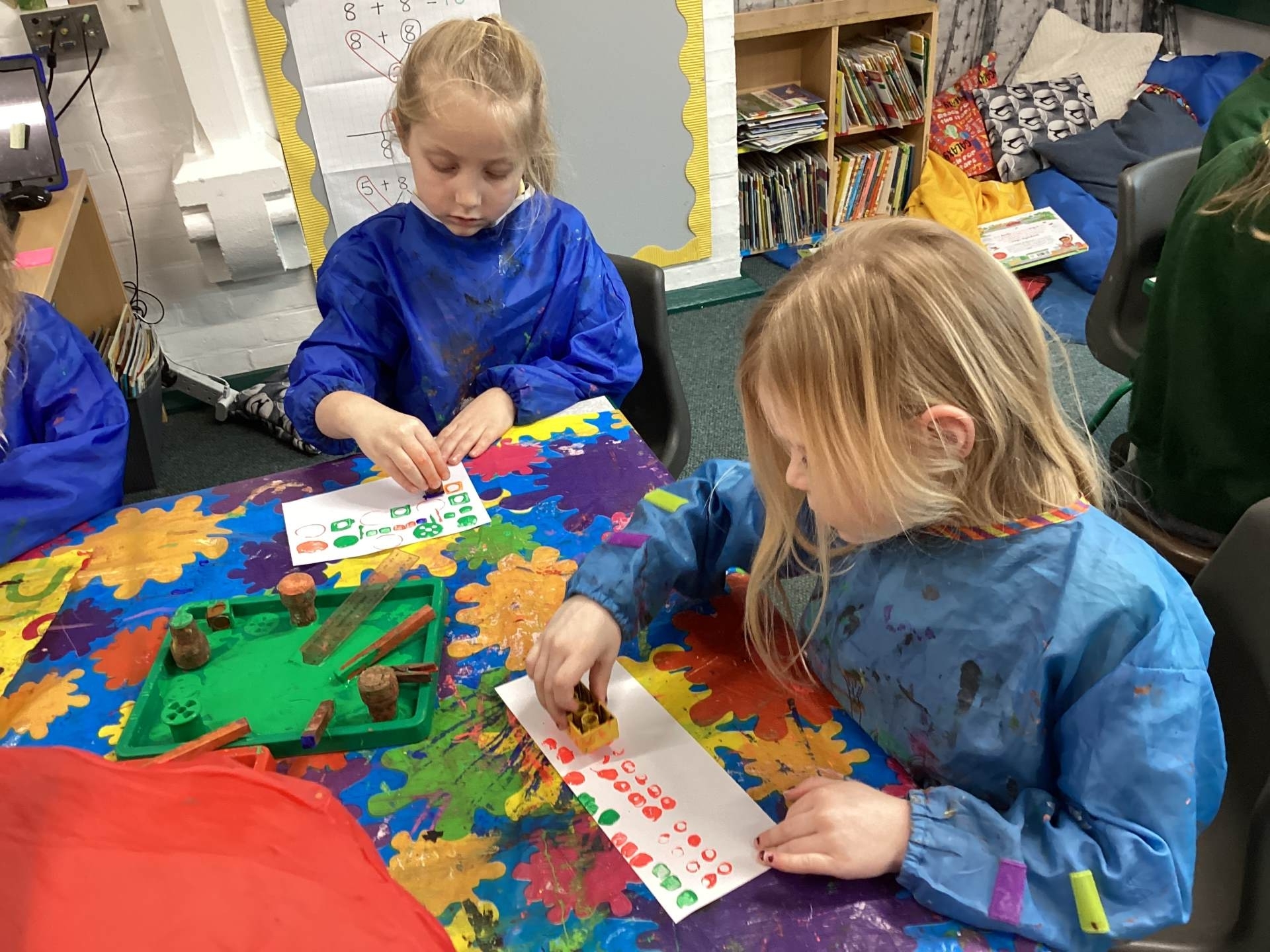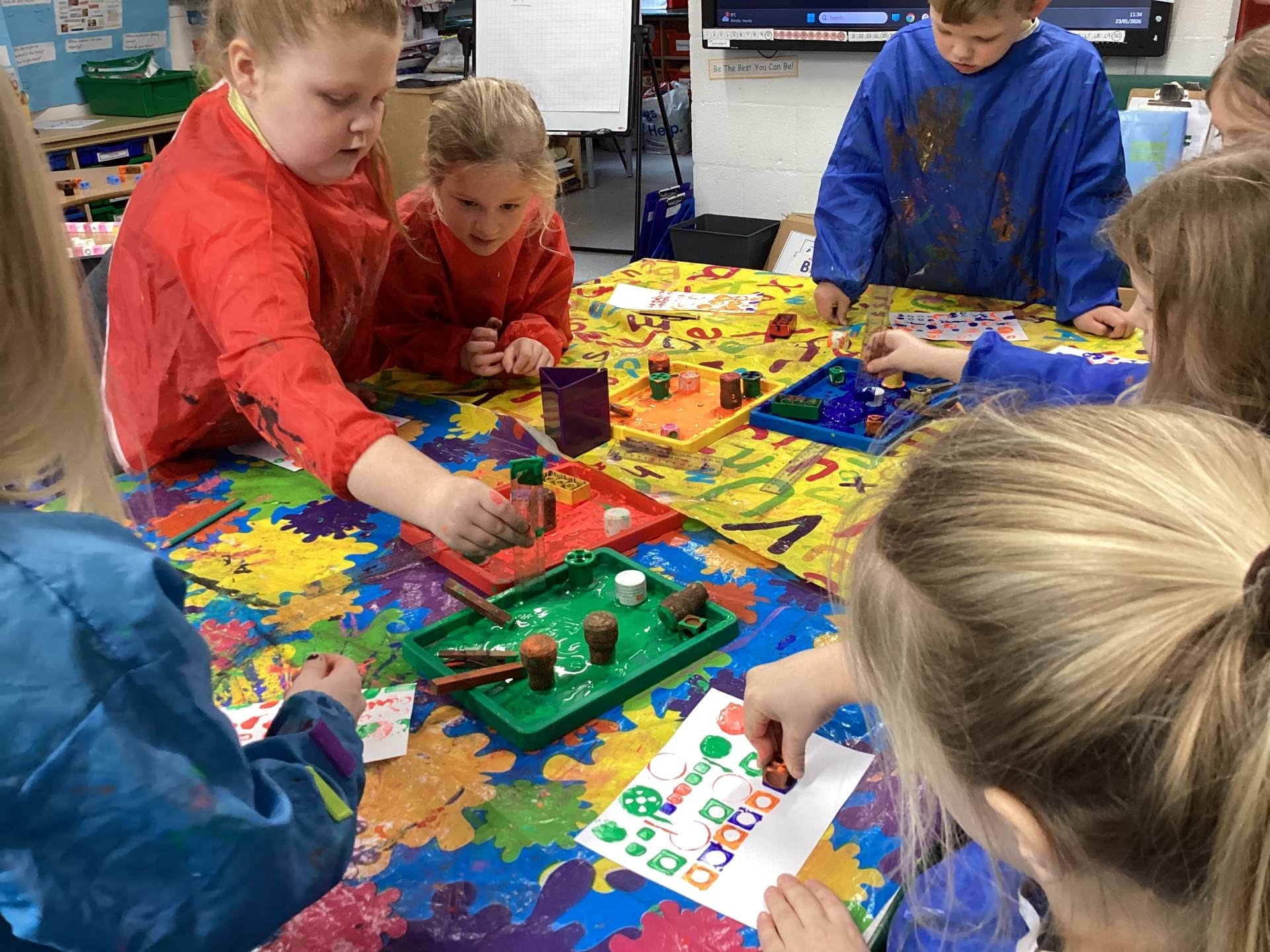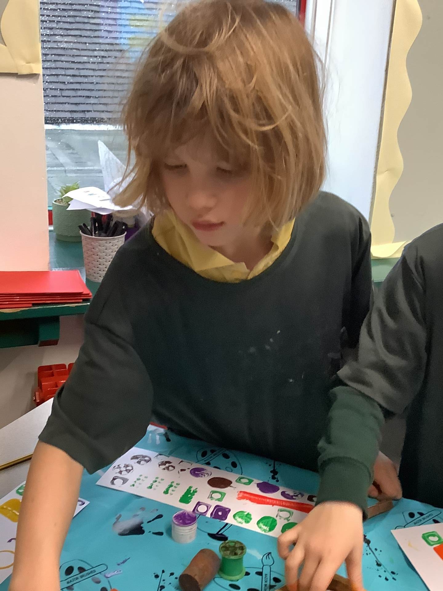 In Art this week we have been learning to press print. We used paint and objects to create repeating patterns on our paper. It was a lot of fun!