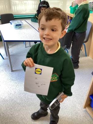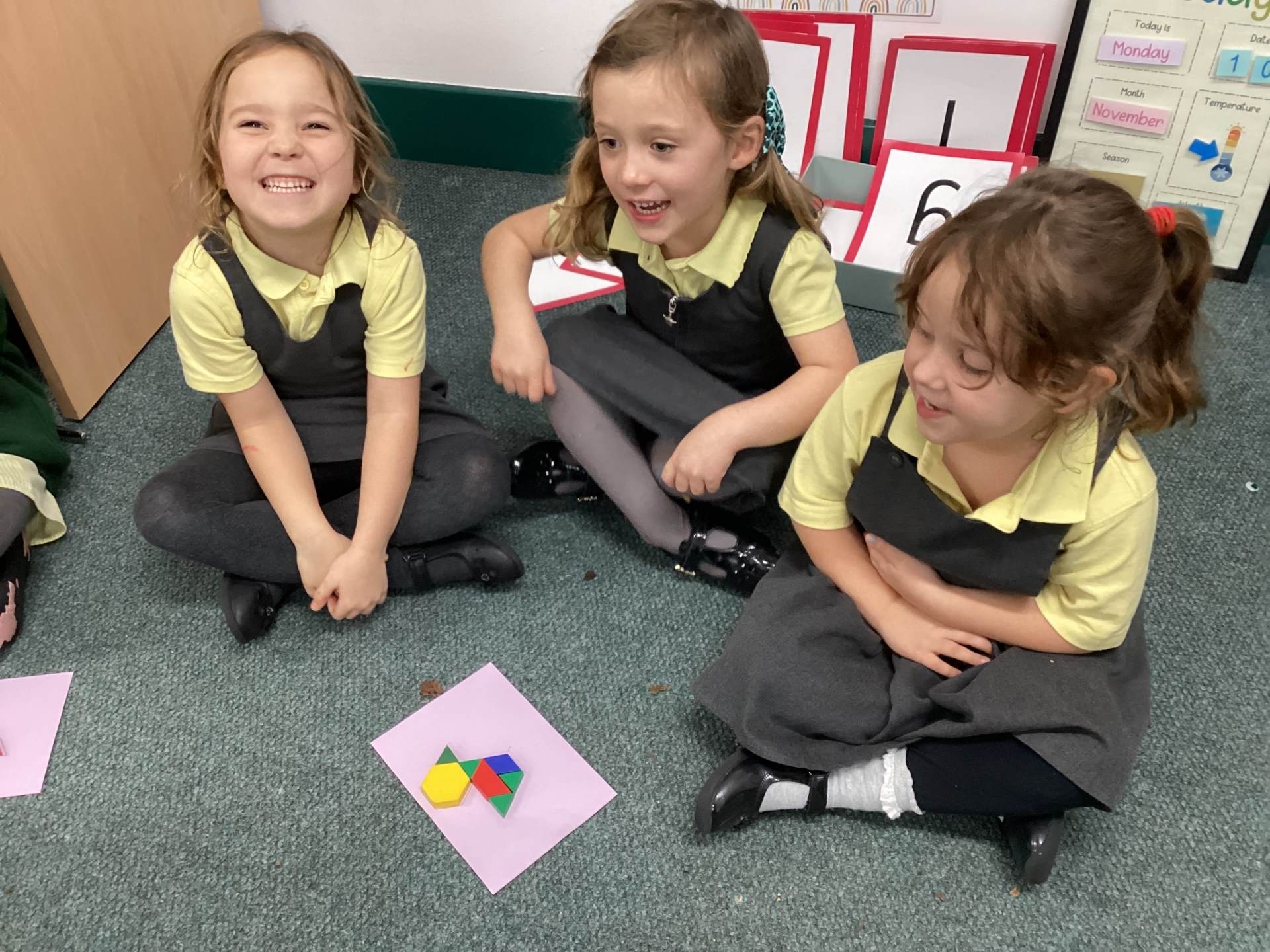 In Maths we have been thinking about shape. We used a piece of paper and tried folding it in different ways. We found out we could create lots of different shapes just by folding. It was great fun! Some children then enjoyed carrying this learning into Discovery Time and folding their own paper and colouring in the shapes they made when the paper unfolded.