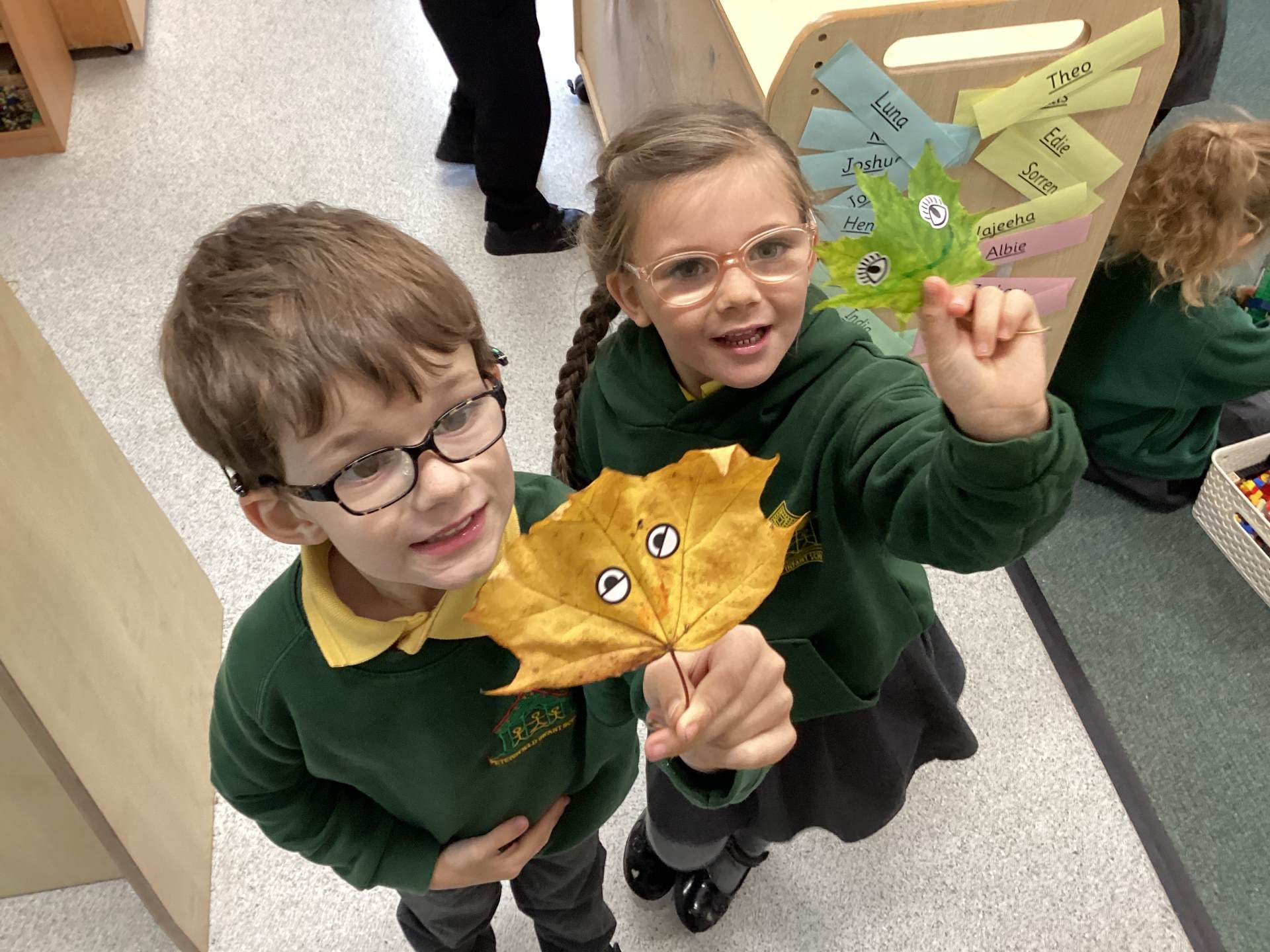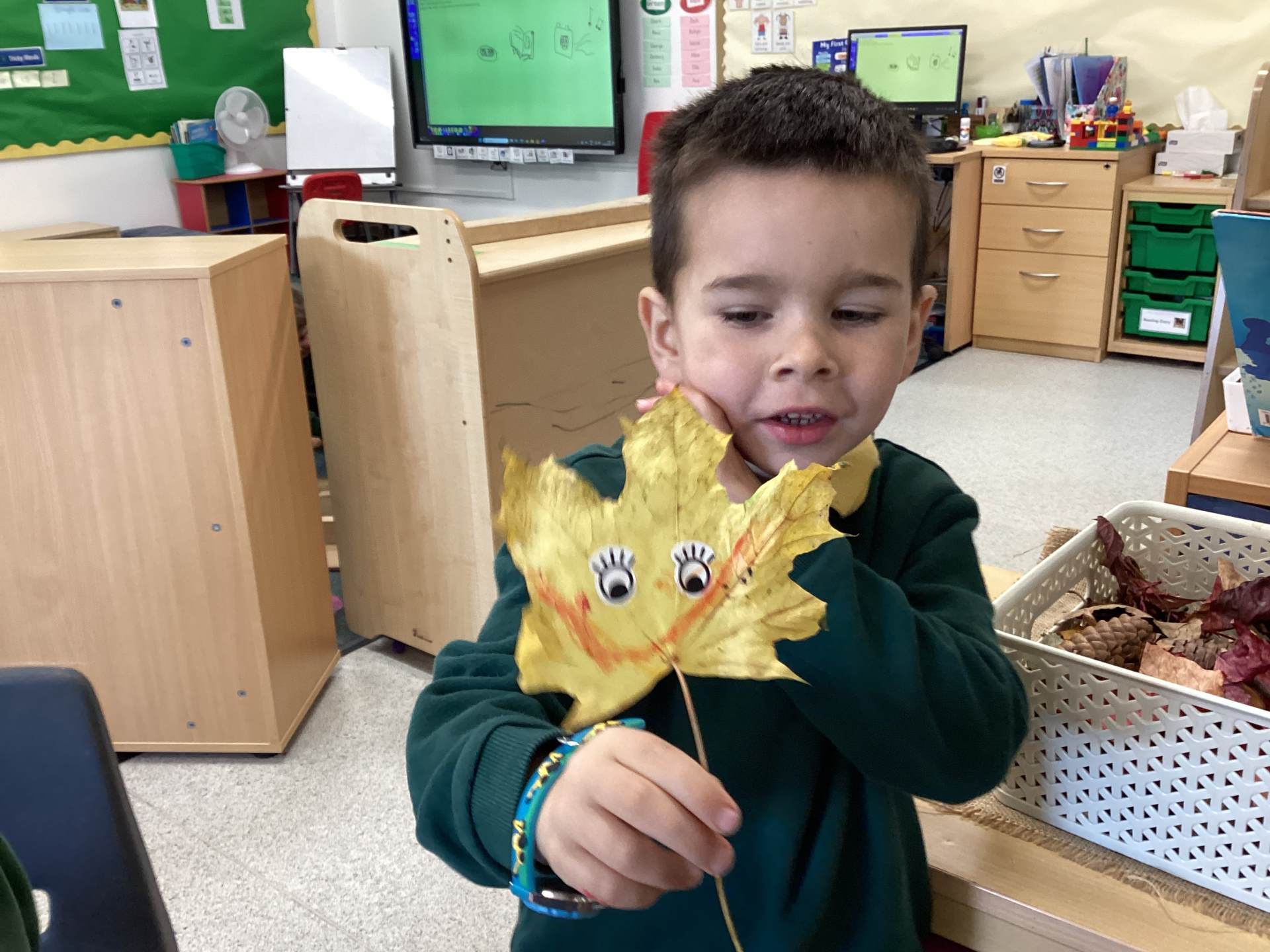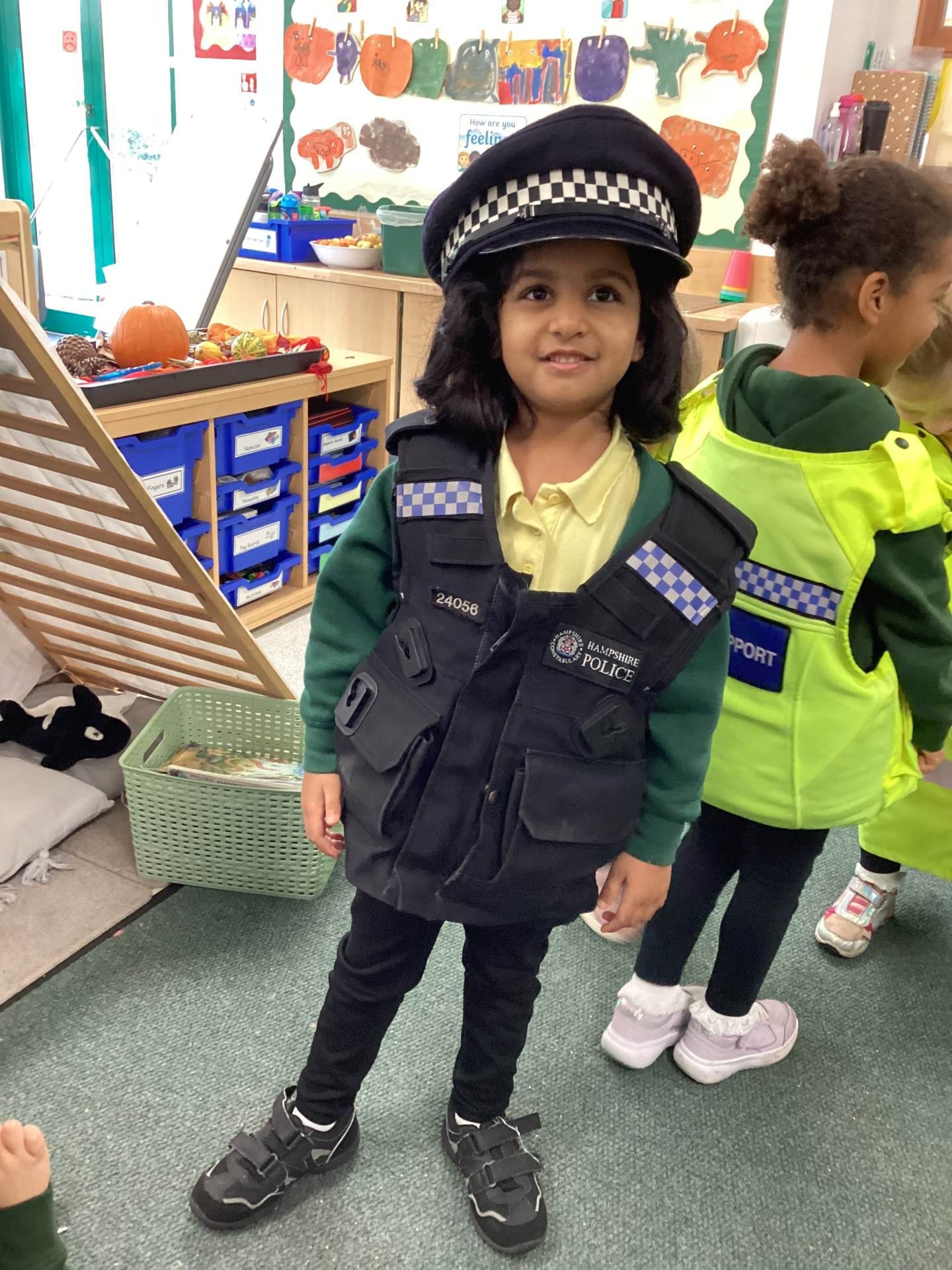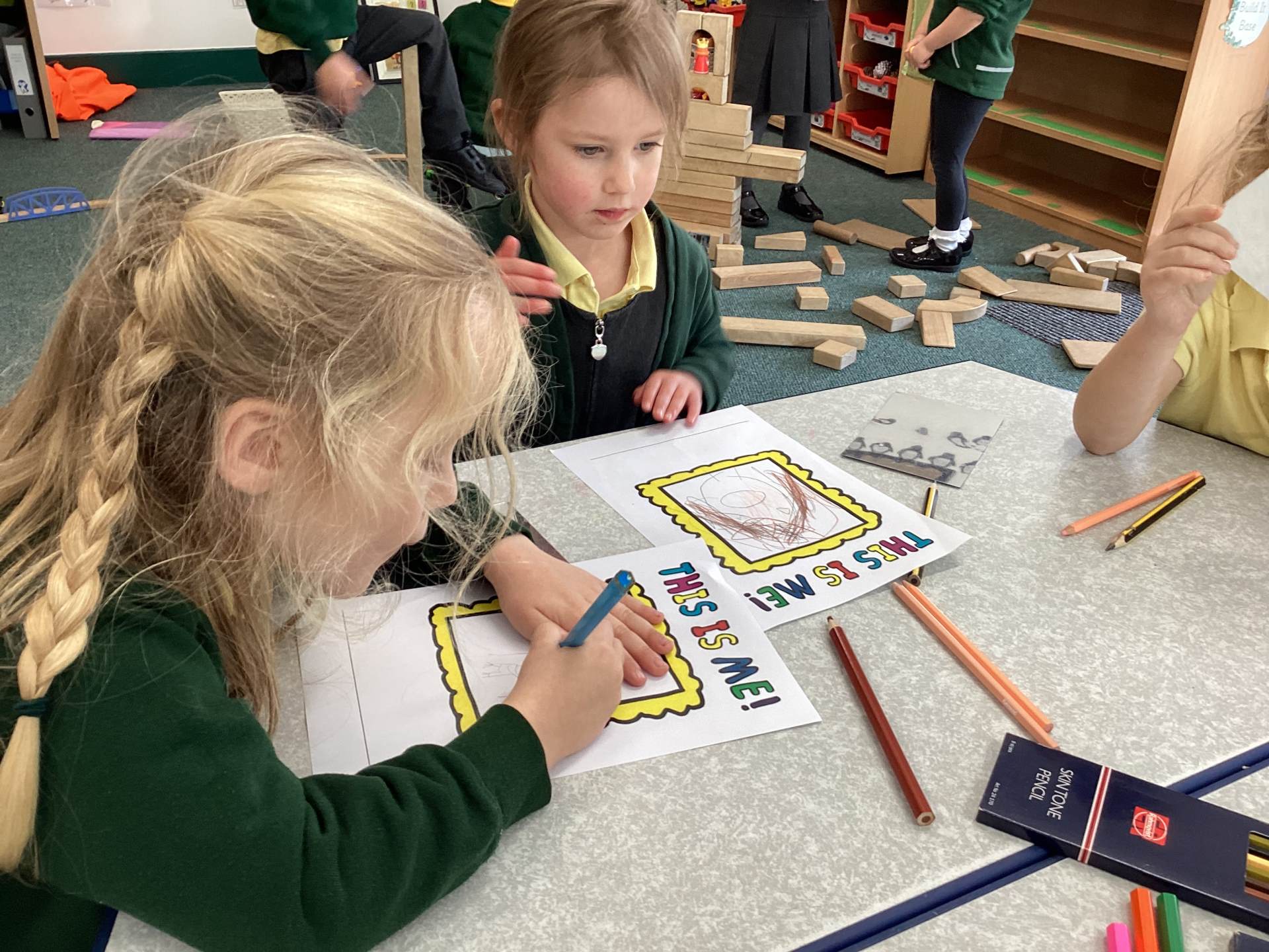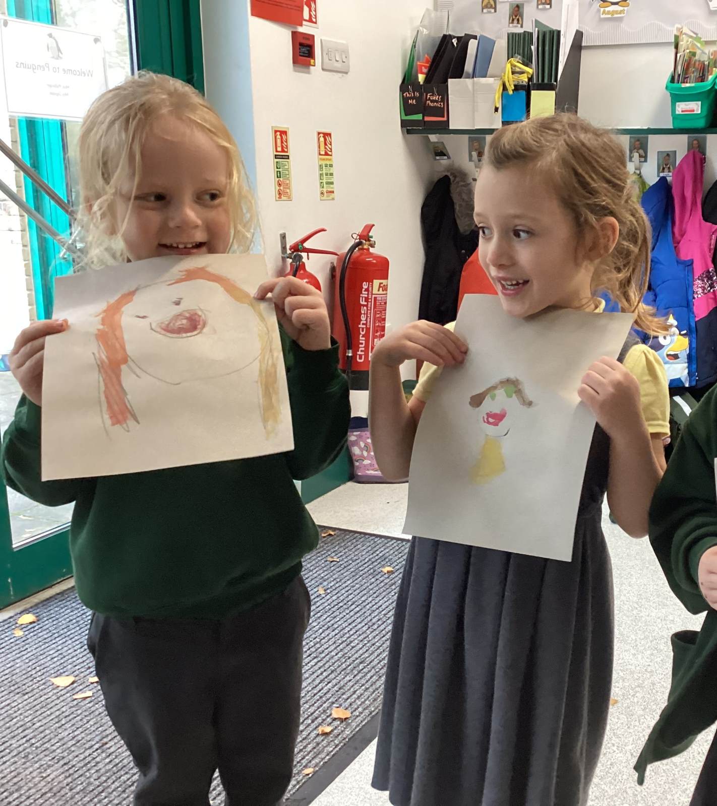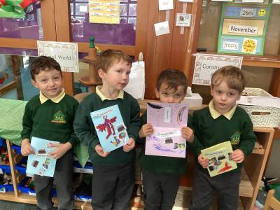 This week we read the story 'The Leaf Thief' in Drawing Club. We were inspired to create our own 'leaf people' which we used in our play. In Funky Fingers we have continued to improve our fine motor and scissor skills, by having a playdough disco, punching holes, and cutting out leaves for our Autumn wreaths. We were all excited to have a visit from the local police this week! We learnt about how the police help us, all the equipment they have and how to turn the flashing lights on in the car! We all had a great time. As we have a half term break next week, we drew a self portrait on our new 'This Is Me' books to take home for the week to record some of the things we get up to. We look forward to sharing the book with our friends when we return to school!
