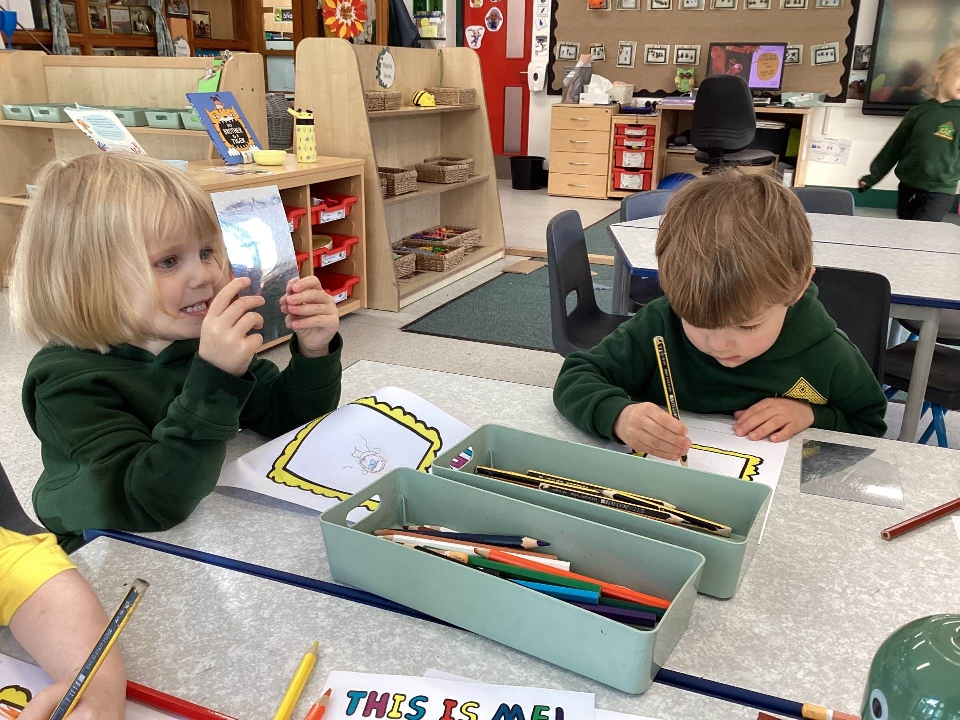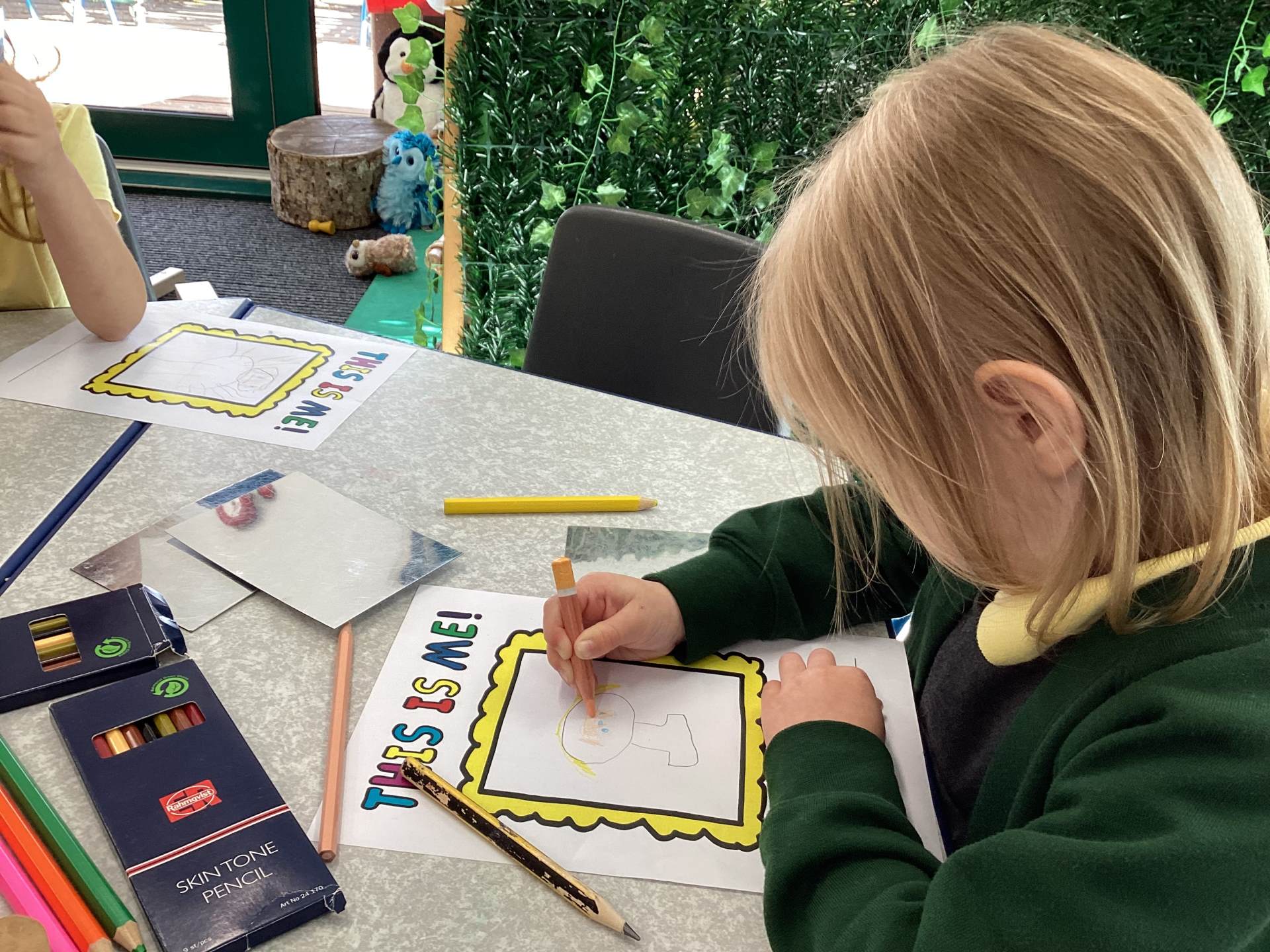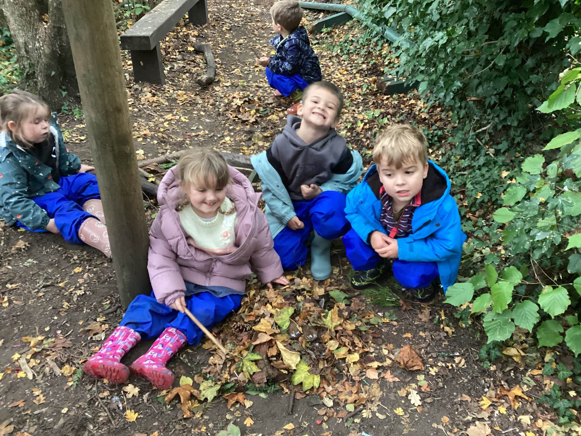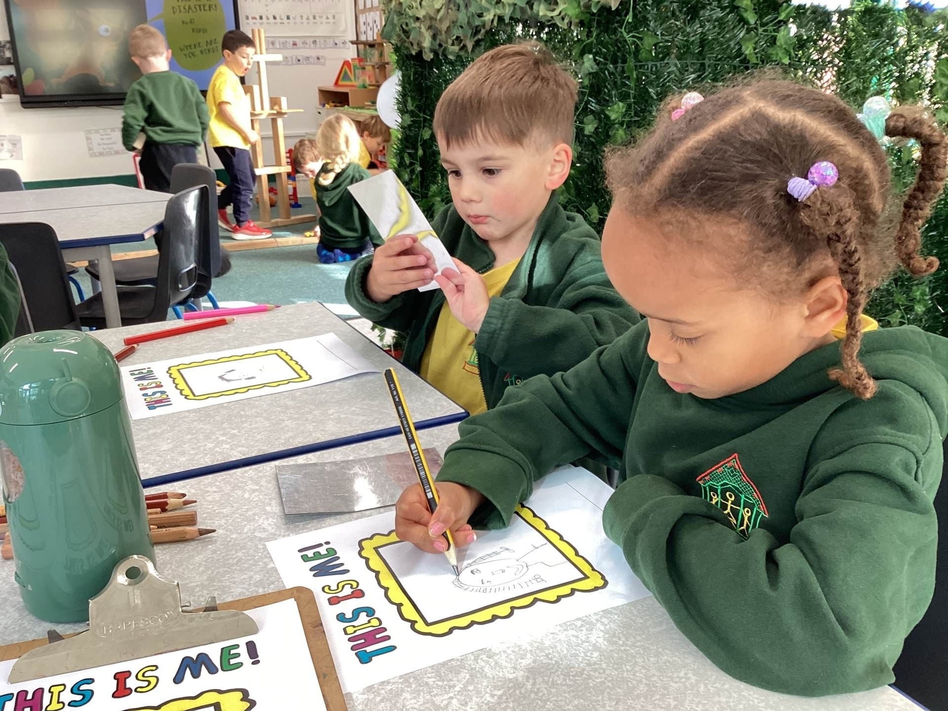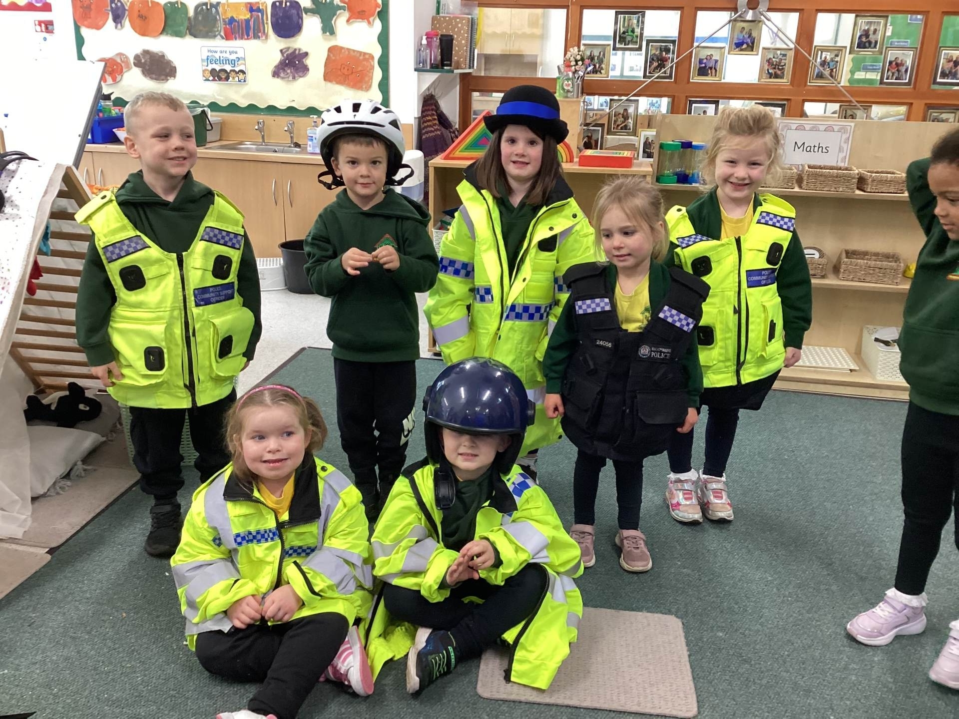 This week we read the story 'The Leaf Thief' in Drawing Club. We were inspired to create our own 'leaf people' which we used in our play. In Funky Fingers we have continued to improve our fine motor and scissor skills, by having a playdough disco, punching holes, and cutting out leaves for our Autumn wreaths. We were all excited to have a visit from the local police this week! We learnt about how the police help us, all the equipment they have and how to turn the flashing lights on in the car! We all had a great time. As we have a half term break next week, we drew a self portrait on our new 'This Is Me' books to take home for the week to record some of the things we get up to. We look forward to sharing the book with our friends when we return to school!