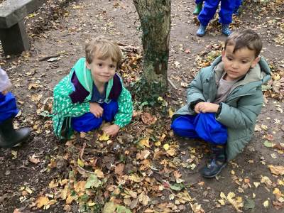 Outside, we have been busy using Autumn objects: In the sandpit we have been pretending the conkers and fir cones are our treasure. In the mud kitchen we have added them to our recipes for mud pies and leaf tea.