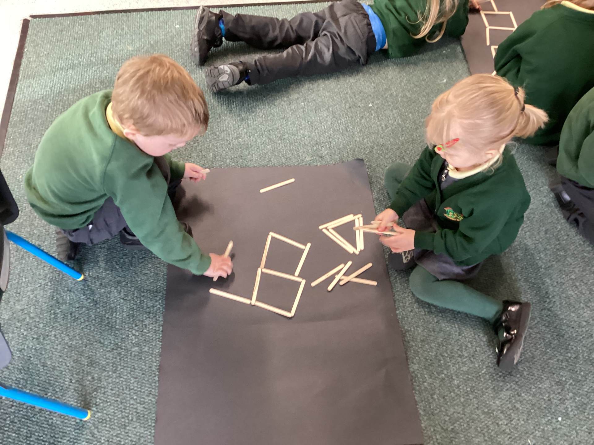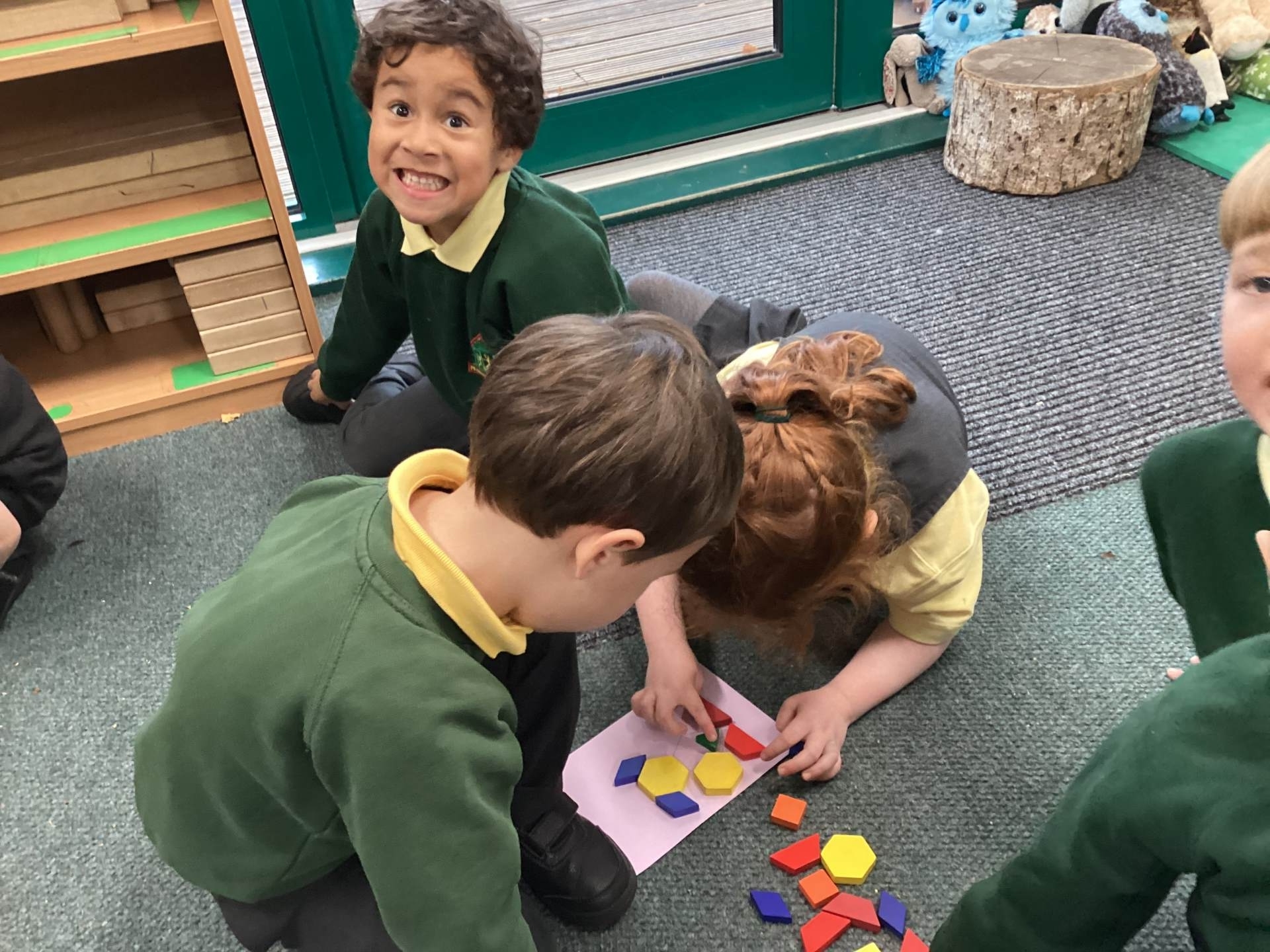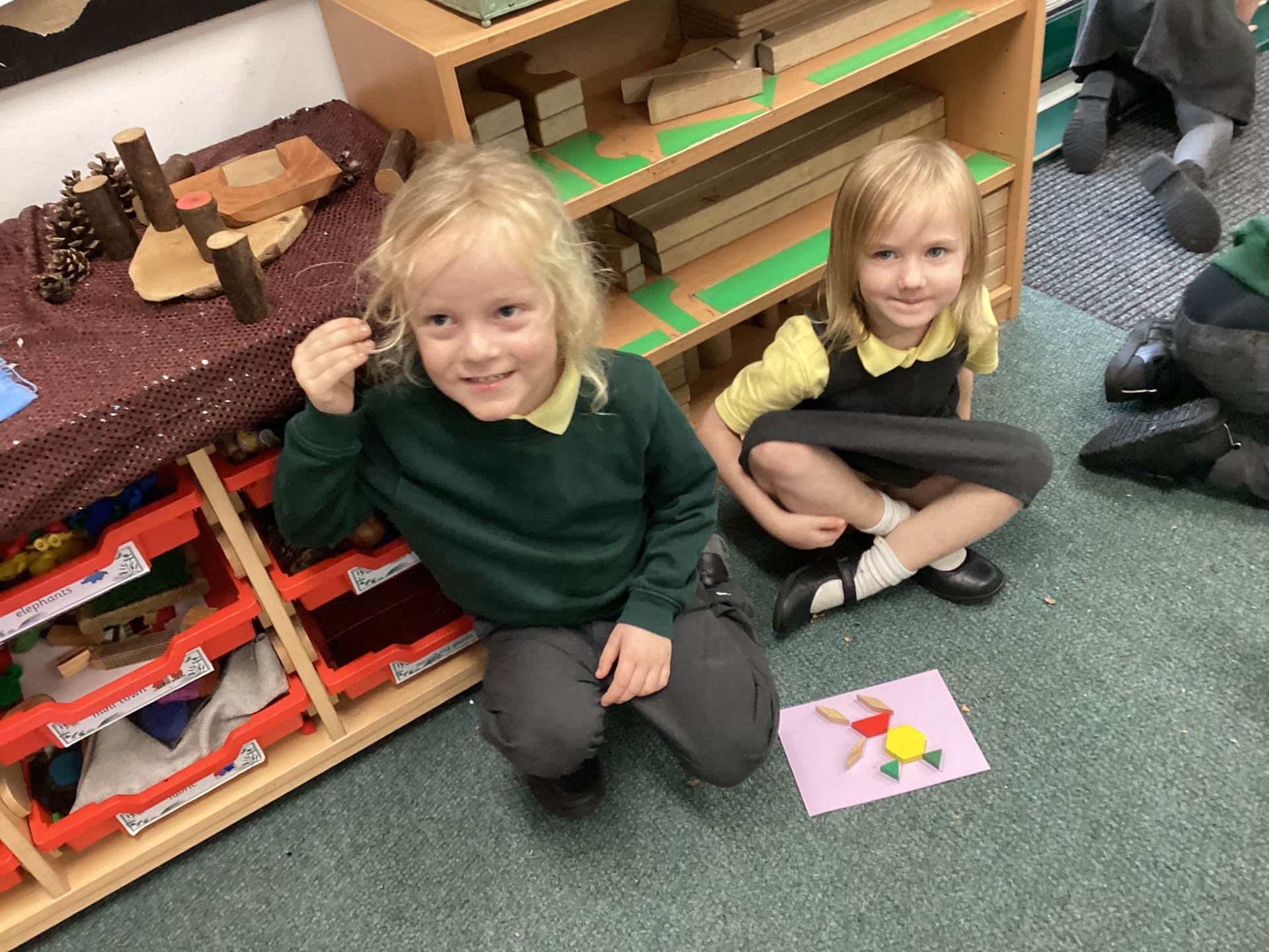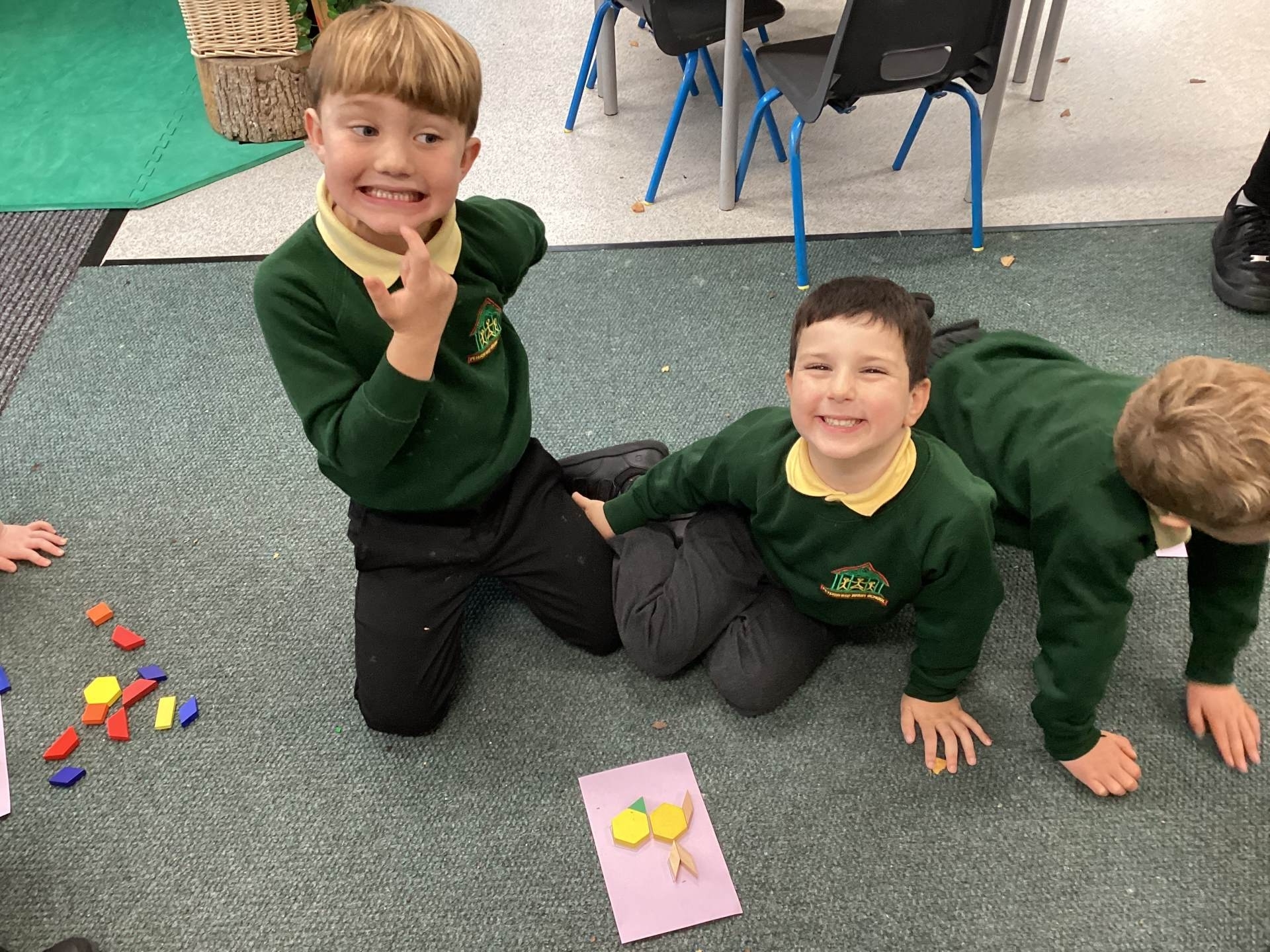 In Maths, we have been thinking about shape. Using pattern blocks, we used trial and error to complete some outlined pictures. We had to arrange, match and fit our shapes into the outlines. There were some great mathematical discussions going on!