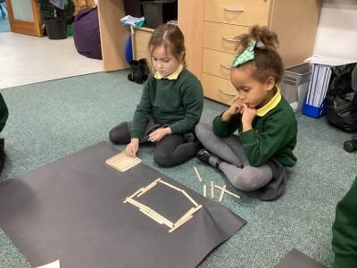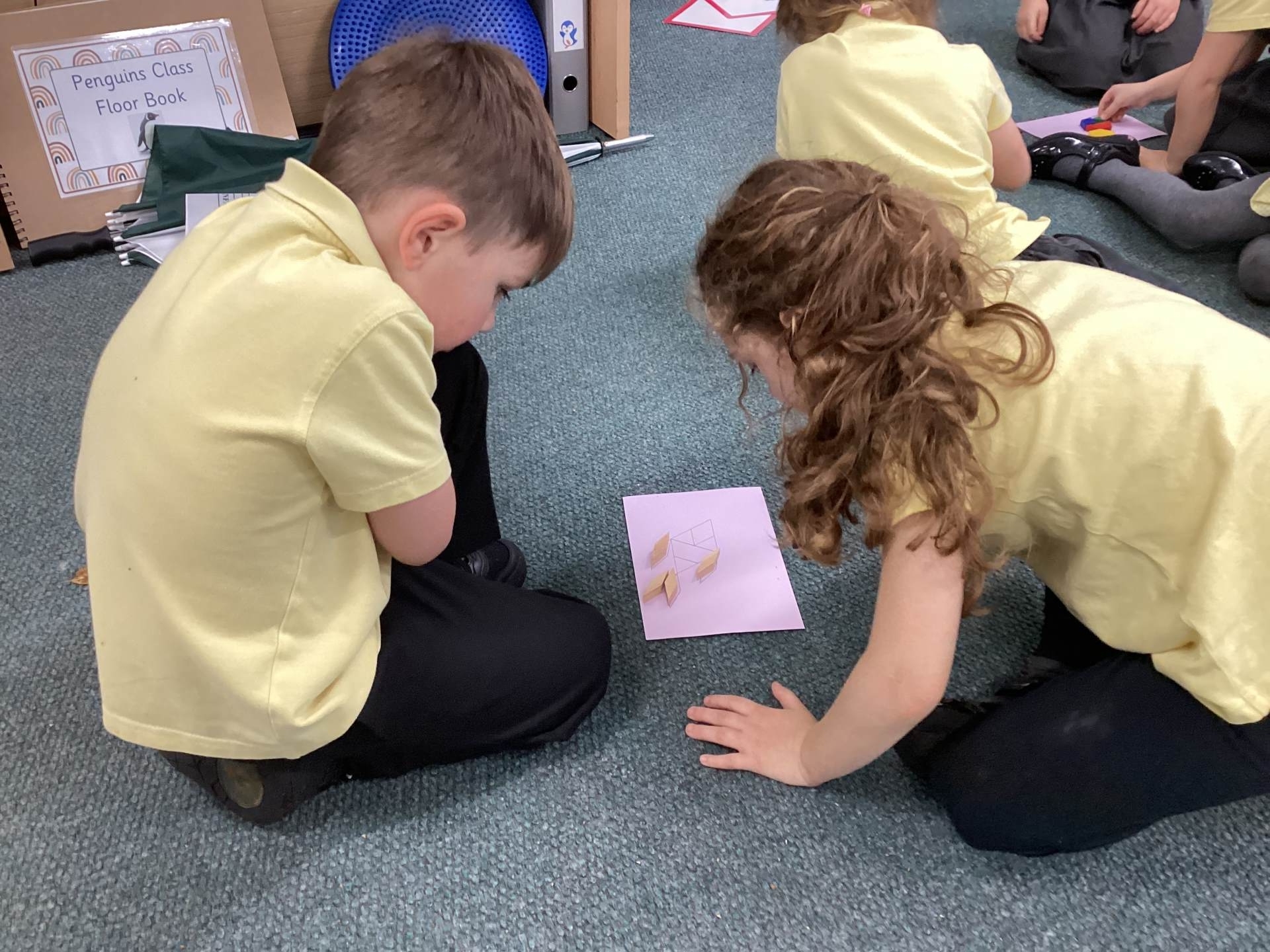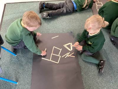 In Maths we have been learning about 2D shapes and that shapes can have other shapes hiding inside them. We enjoyed folding and cutting paper shapes into parts to create our own shape pictures.
