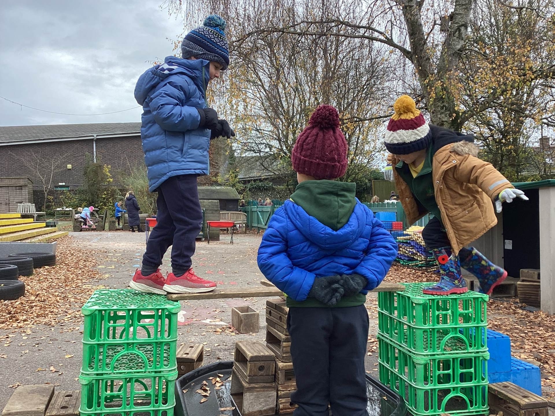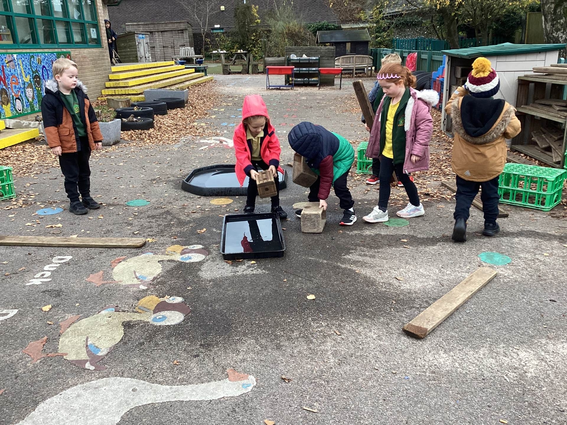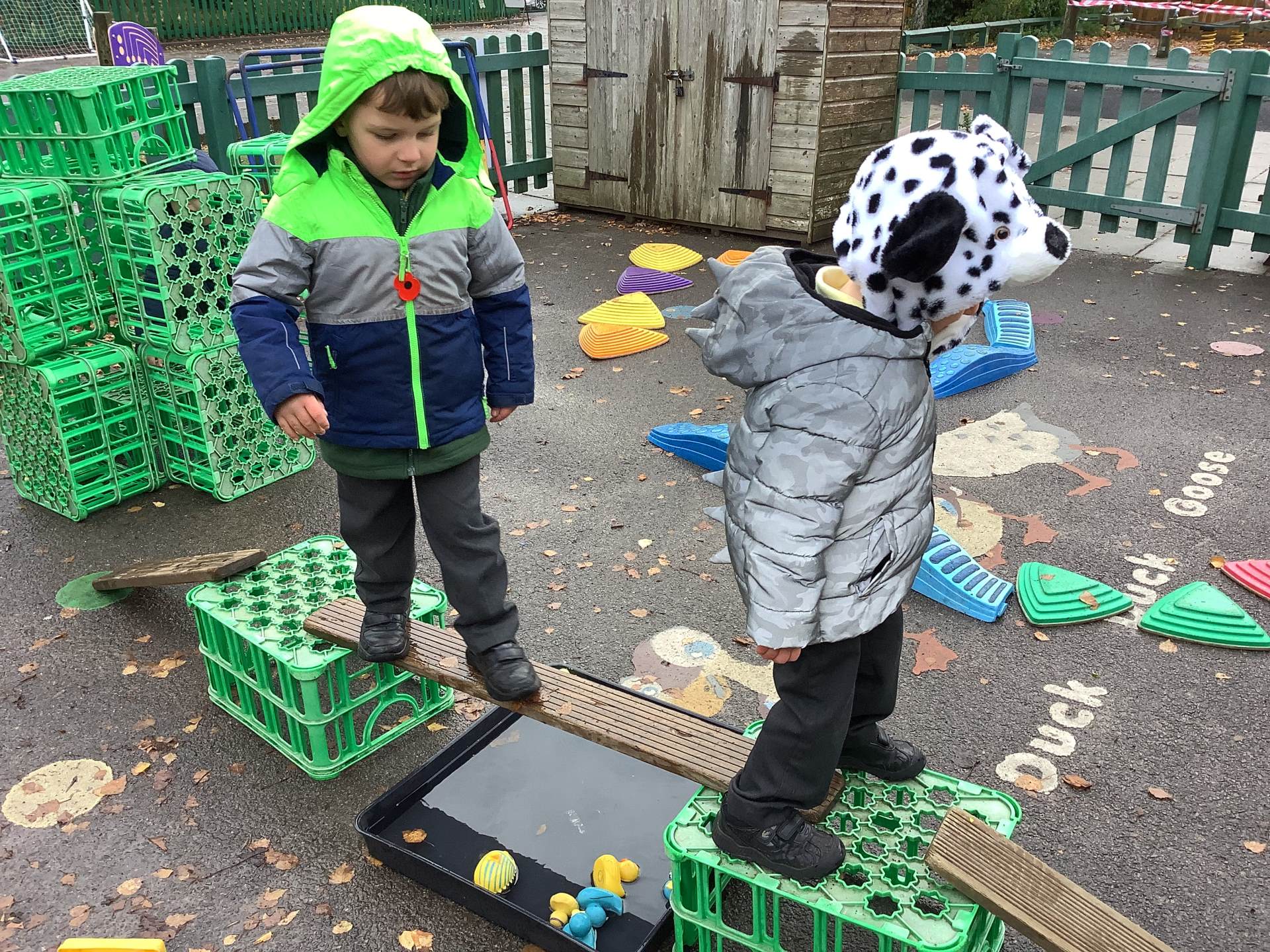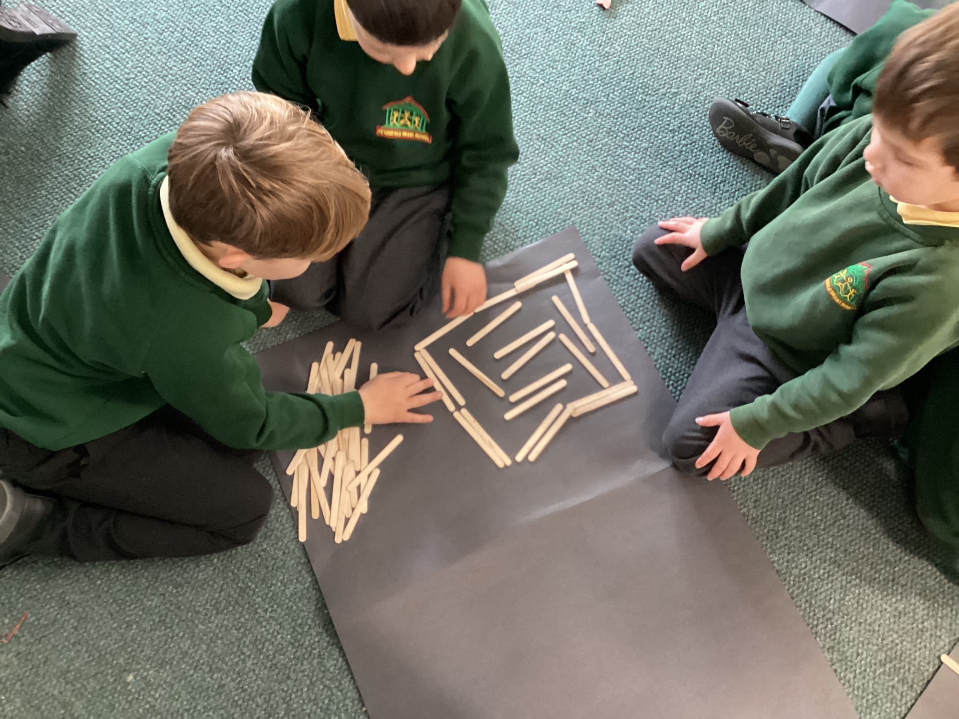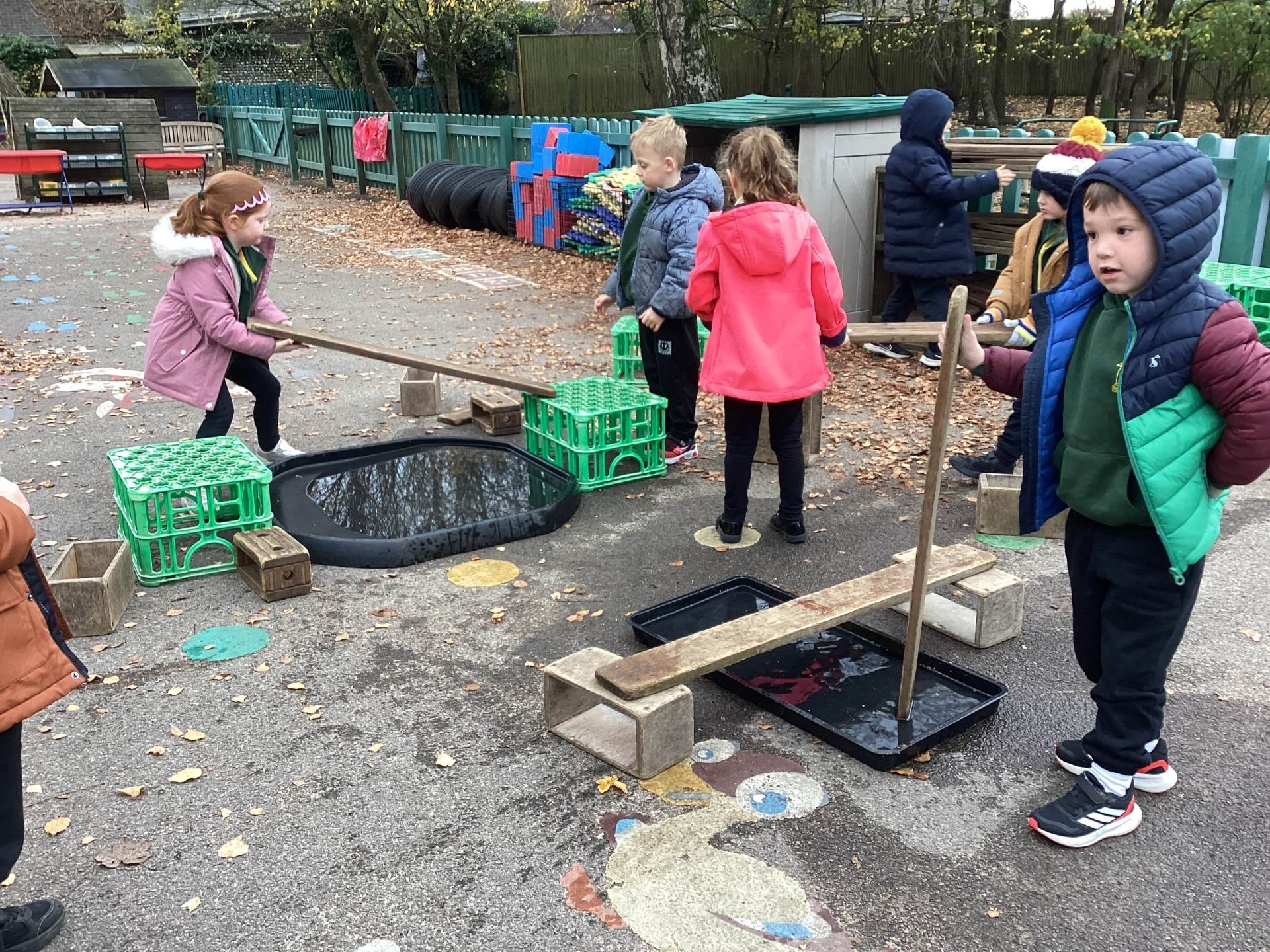 We have also taken our maths learning outside, making Numberblock 4 with the big green crates.