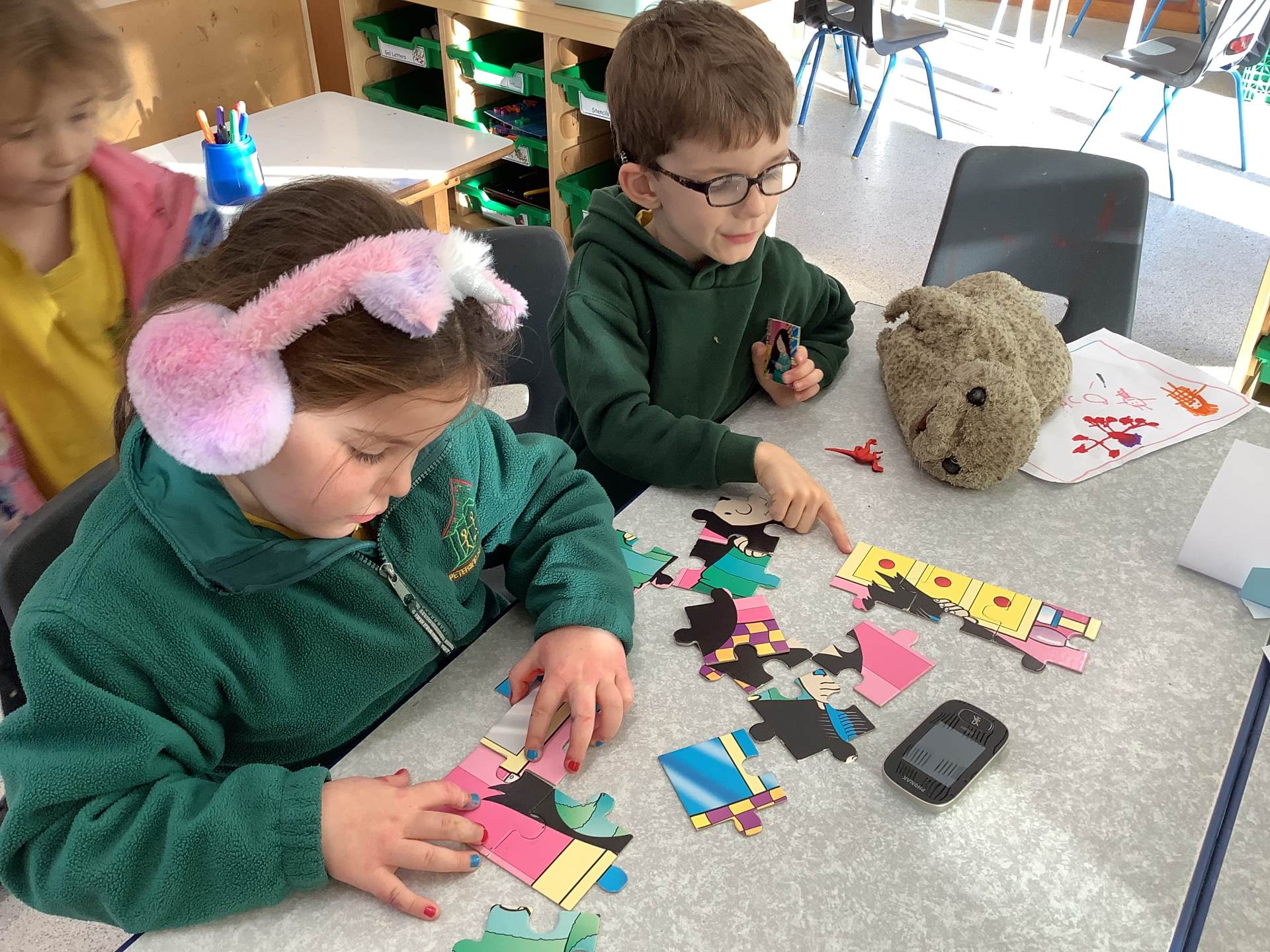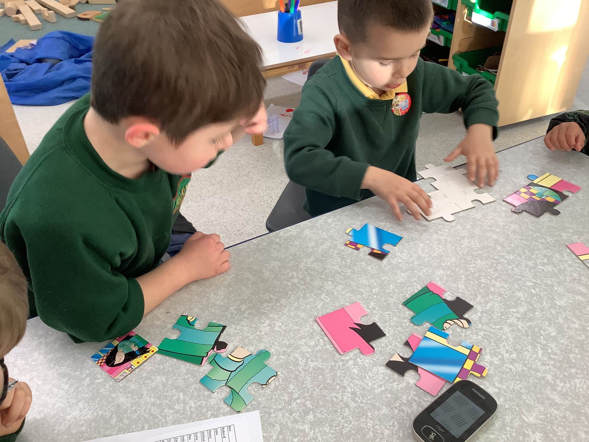 In maths, we have been exploring the concepts of 'parts' and 'whole'. One of our activities included completing jigsaw puzzles while talking about which 'part' goes where, to make the 'whole' puzzle.